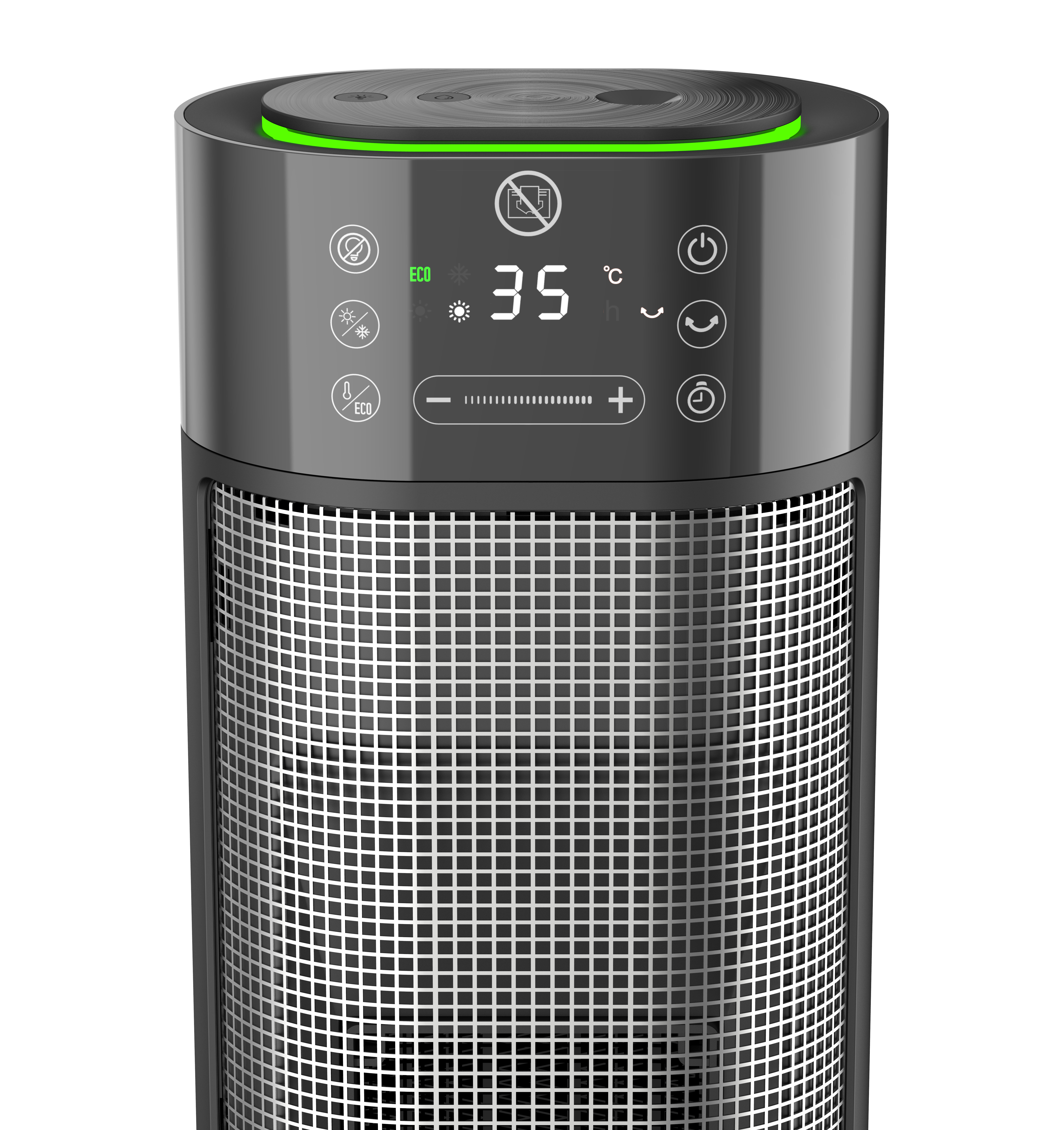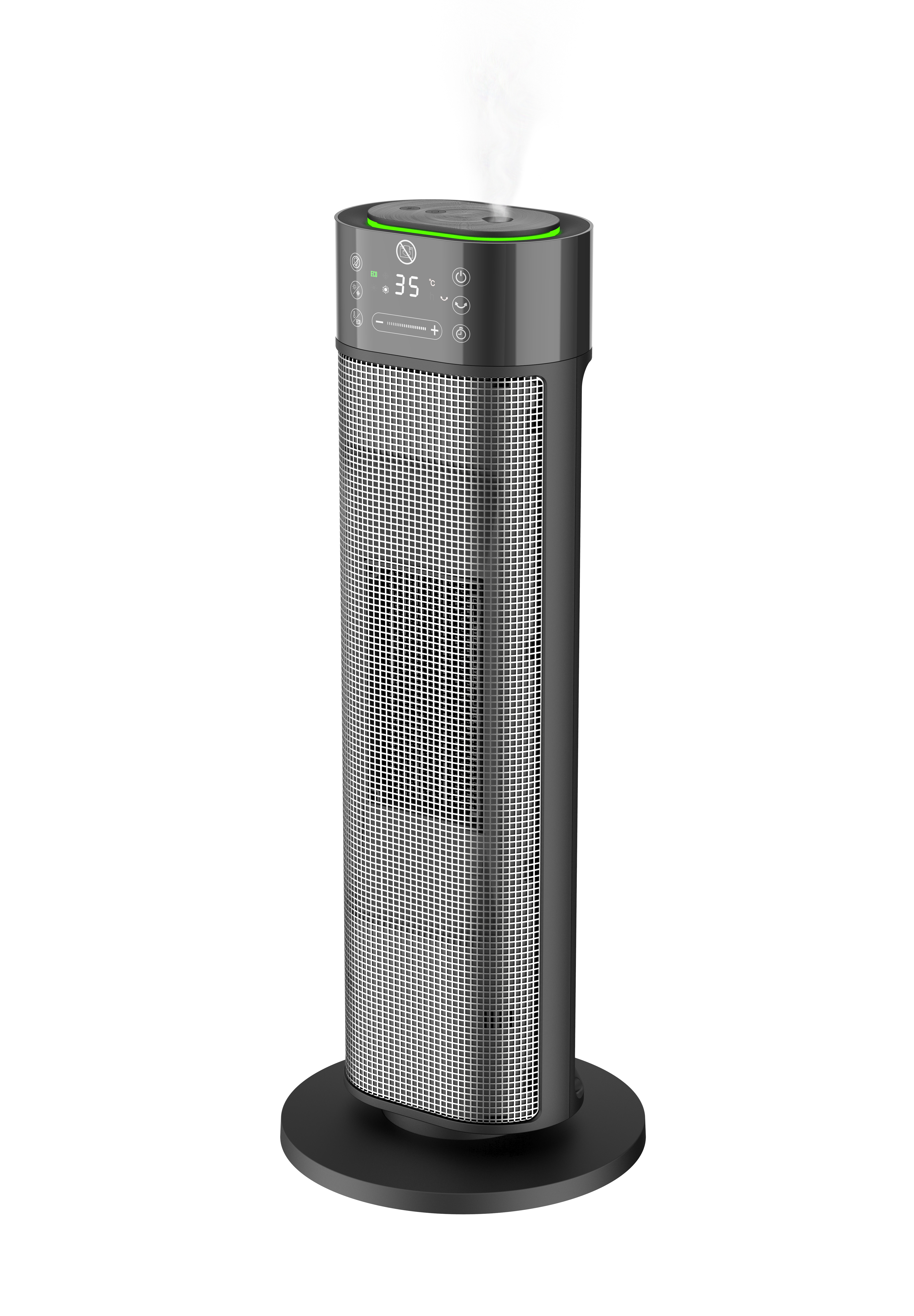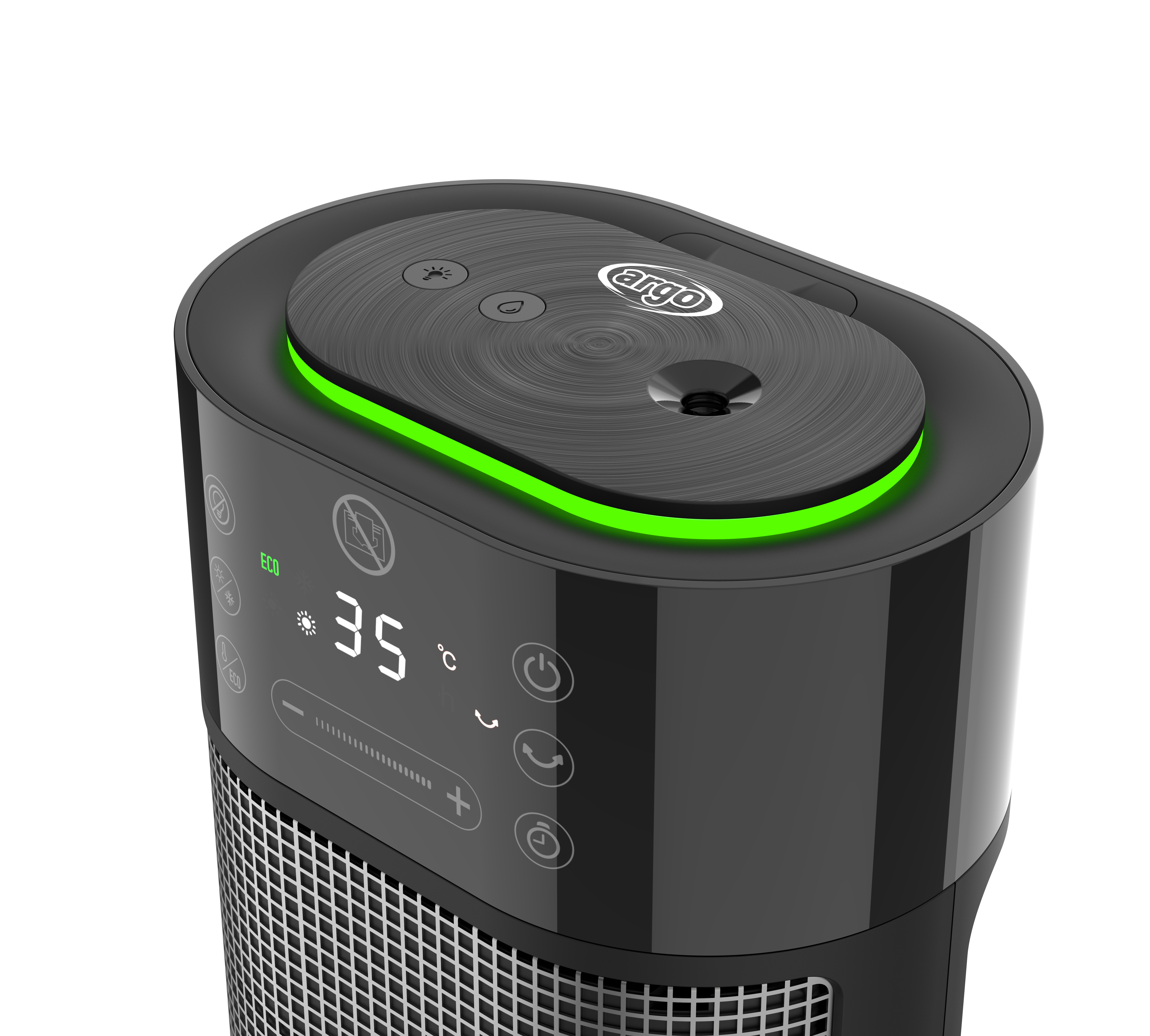 Argoclima TECH TOWER HUMY Keramik Heizlüfter mit seinem modernen Techno-Design und eleganter, matter Oberfläche komplett in Schwarz ist mehr als eine elektrische Zusatzheizung. Er vereint eine leistungsstarke Keramikheizung, ultraschallbasierte Luftbefeuchtung und stimmungsvolles LED-Licht in einem eleganten Turmgerät. Dieser leistungsstarke Turmheizlüfter mit PTC-Heizelement der neuesten Generation sorgt im Winter für eine angenehme Wärme und im Sommer für eine erfrischende Kühle und befeuchtet die Luft. Mit 3 Heizmodi (ECO/COMFORT/ANTI-FROST), spezieller ECO SMART-Funktion und den 2 Leistungsstufen (1300/2000 Watt) sorgt er für eine angenehme Raumtemperatur in Bereichen bis 24 m² (50 m³). Die Bedienung erfolgt entweder über das integrierte LED‑Bedienfeld oder über die mitgelieferte Fernbedienung. Eine automatische horizontale Schwenkbewegung von bis zu 80° gewährleistet eine gleichmäßige Luftverteilung im Raum. Für Sicherheit sorgen ein integrierter Kippschutz sowie ein Überhitzungsschutz, die eine zuverlässige und sichere Nutzung ermöglichen.