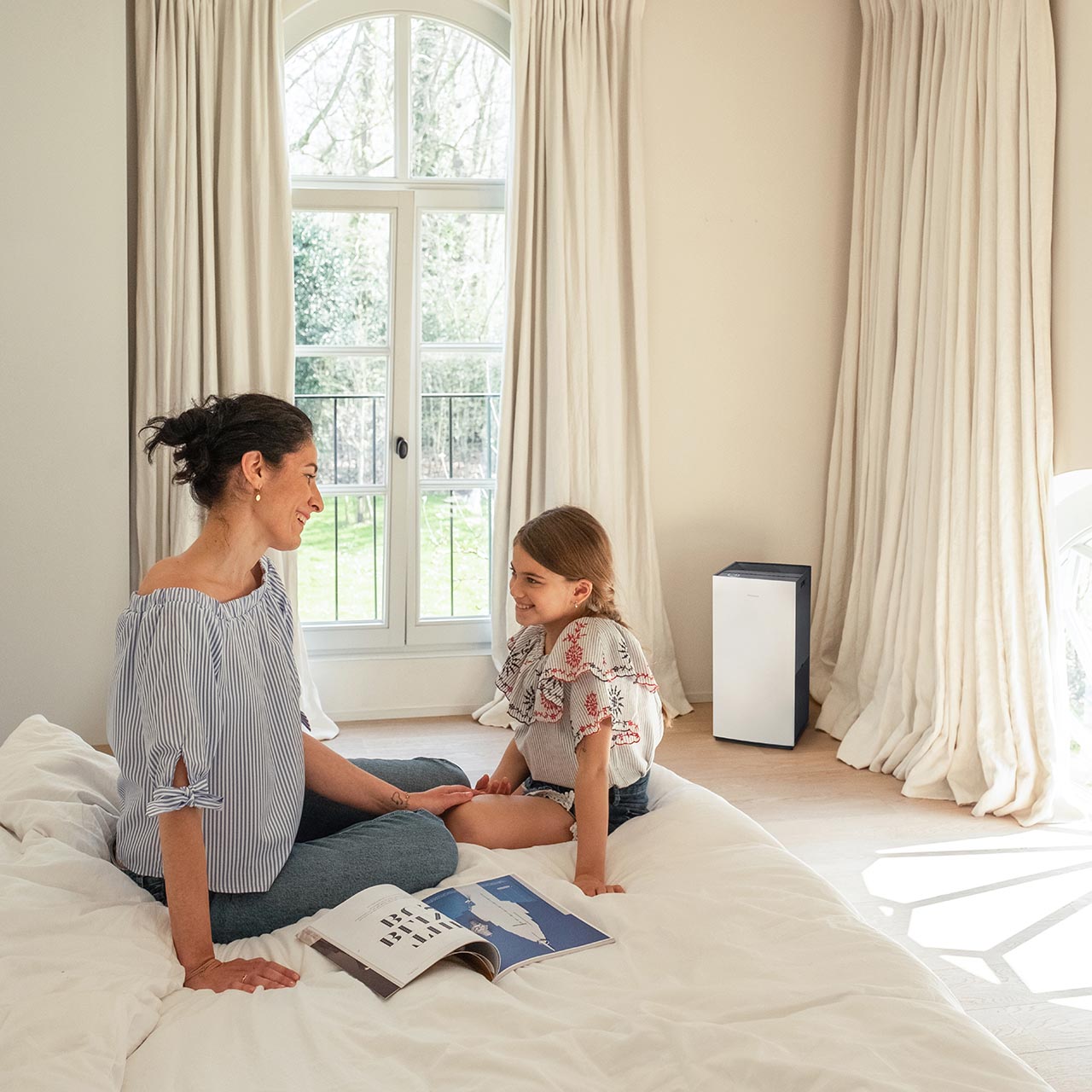 Daikin MC80Z Luftreiniger mit integrierter WLAN sorgt mit seiner Dual-Streamer-Technologie, der aktiven Plasma-Ionen-Entladung und dem leistungsstarken elektrostatischen HEPA-Filter für saubere und gesunde Luft in Räumen bis zu 124 m². Die Bedienung ist von jedem Standort aus möglich, einfach über die Onecta-App, aber natürlich auch am Gerät selbst. Der kompakte wie leistungsstarke Luftreiniger ist mit nur 19 dB(A) einer der leisesten Luftreiniger Europas. Der HEPA-Filter absorbiert Feinstaub und Schadstoffe ohne zu verstopfen und hat eine Lebensdauer von zehn Jahren. Die Streamer-Technologie inaktiviert gesundheitsschädliche Viren zuverlässig zu 99,9 % und baut andere Schadstoffe wie Gerüche und Allergene effektiv ab. Gemeinsam sorgen sie für eine saubere und gesunde Raumluft. Die Luftqualität wird durch Sensoren überwacht und durch das farbige DAIKIN Eye visuell dargestellt. Zur weiteren Ausstattung gehören Funktionen wie Sleep- oder Turbo-Modus, Kindersicherung, automatischer Start nach Stromausfall, Helligkeitsregelung. Daikin - für eine gesunde Umgebungsluft.