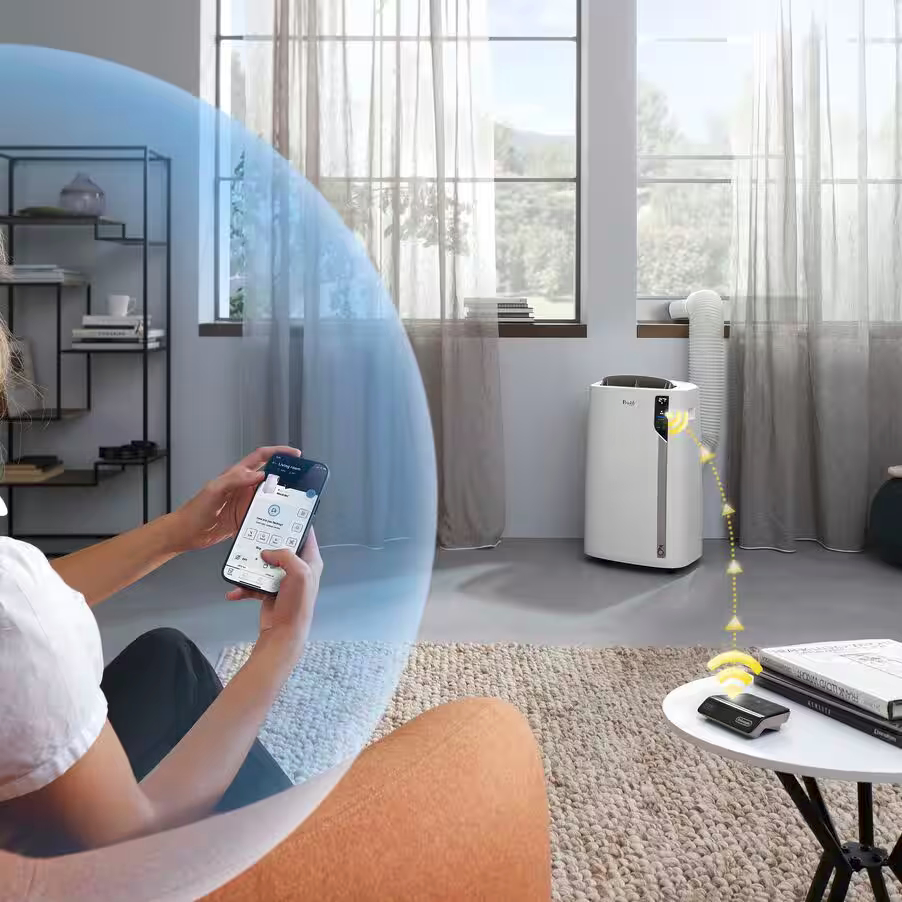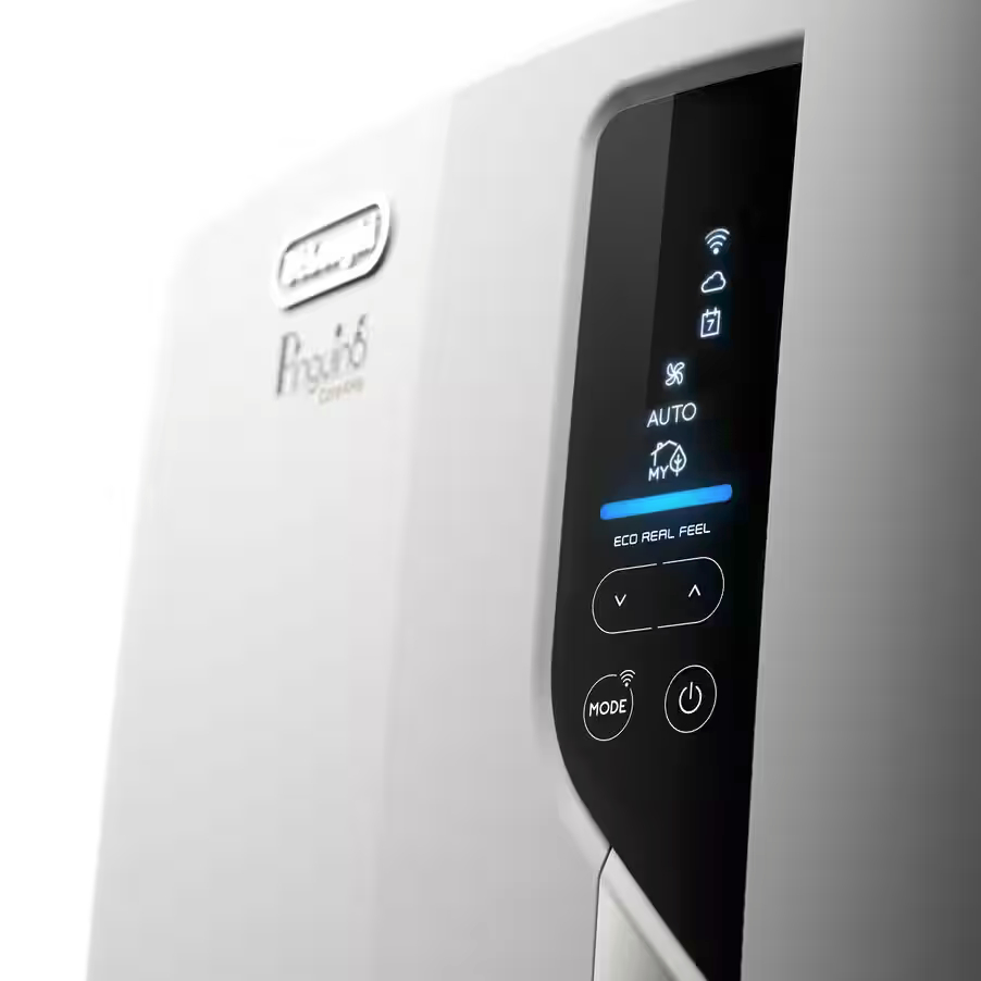 DeLonghi Pinguino Care4Me PACEL112CSTWIFI Klimagerät mit Energieklasse A DeLonghi Pinguino Care4Me PACEL112CSTWIFI Klimagerät bietet die perfekte Kombination aus Technologie und niedrigem Energieverbrauch (Energieklasse A+). Pinguino ist eine mobile Plug&Play-Lösung, die dank Rollen und integrierter Griffe einfach zu transportieren ist. DeLonghi Klimaanlage mit WiFi-Funktion ist ein leistungsstarkes und effizientes 3-in-1 Gerät: mit einer Kühlleistung von 11.000 BTU/h (2.900 Watt), einer Entfeuchtungsleistung von 41 Liter / Stunde und drei Ventilationsstufen. Pinguino lässt sich einfach direkt am Gerät bedienen (Display mit Touchpanel), Fernbedienung oder per Comfort App und Sprachsteuerung wie Amazon Alexa und Google Assistant von überall aus steuern. Verwenden Sie Pinguino nur dann, wenn Sie ihn benötigen. Smart Sensing-Funktion überwacht Temperatur und Luftfeuchtigkeit in der Umgebung. Cool Surround™-Technologie: sorgt für eine präzise Kühlung genau dort, wo Sie sich befinden und die Smart Sensing-Funktion überwacht Temperatur und Luftfeuchtigkeit in der Umgebung. MyEcoRealFeel-Technologie: Personalisieren Sie Ihren persönlichen Wohlfühlkomfort mit MyEcoRealFeel per App. Diese Funktion hilft Ihnen, Ihr ideales Komfortniveau automatisch zu erreichen und aufrechtzuerhalten und gleichzeitig bis zu 30 % Energie zu sparen. Geofencing-Funktion, Sprachassistent und App: Mit der Geofencing-Funktion des Pinguino können Sie Ihre Klimaanlage so programmieren, dass sie sich automatisch einschaltet, wenn Sie sich in der Nähe Ihres Hauses befinden. Merkmale: Für Bereiche bis 44 m² 3-in-1-Gerät: Nur Ventilator, Klimaanlage und Entfeuchtung Energielabel: A+ WiFi-Funktion: Steuerung mit De'Longhi Comfort APP Sprachsteuerung mit Amazon Alexa, Google Assistant Display mit Touchpanel oder Fernbedienung Intelligente Fernbedienung mit Cool Surround™-Technologie My EcoRealFeel-Technologie: bis zu 30 % weniger Energieverbrauch Leistungsstarke Kühlleistung (11.000 BTU/h – 2,9 kW) für Räume bis 110 m3 3 Ventilatorstufen Entfeuchtungsleistung 41 Liter / Tag Auto-Modus Selbstdiagnose Timer Display mit Comfort-Light-Anzeige Einfach zu transportieren Umweltfreundliches Kältemittel: R290