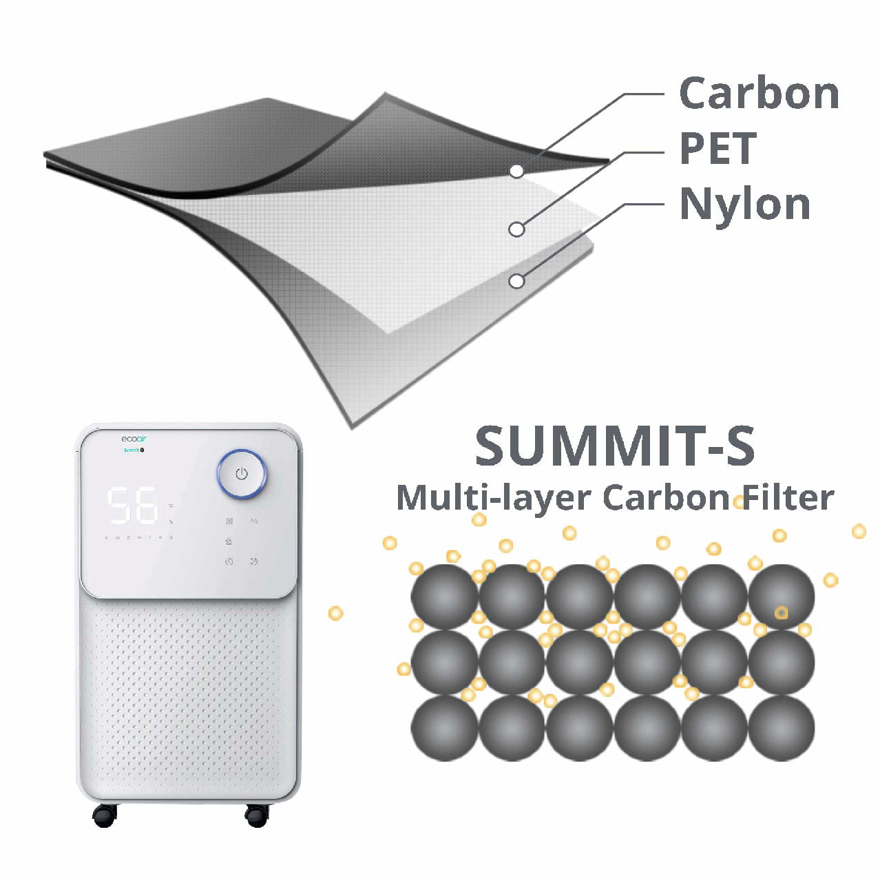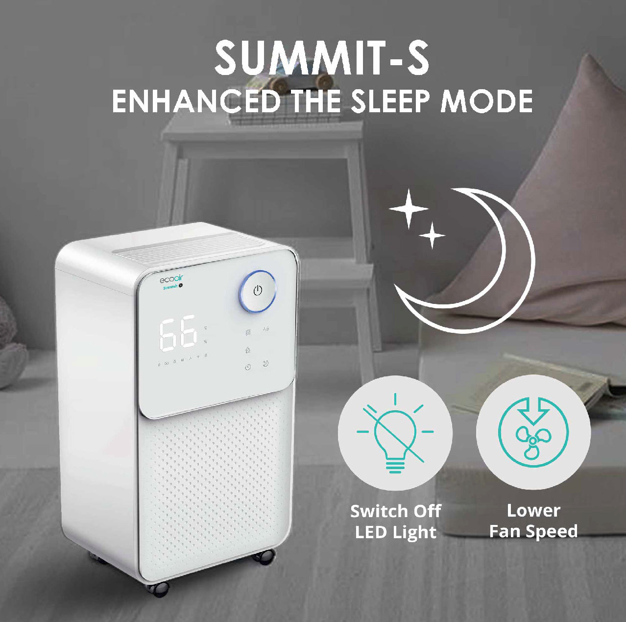 EcoAir Summit S Luftentfeuchter der Energiesparer mit einem Verbrauch von 156 Watt EcoAir Summit S Luftentfeuchter ist ein 'Niedrigenergie-Entfeuchter" mit einer Leistungsaufnahme von nur 156 Watt! Mit einem energiesparenden Luftentfeuchter können Sie Ihre Wohnumgebung komfortabel und gesund halten, ohne sich um hohe Stromkosten kümmern zu müssen. Summit S verfügt über eine Entfeuchtungskapazität von 12 Litern pro Tag in Räumen bis zu 50 m². Dieser Luftentfeuchter reinigt die Luft mit einem dreischichtigen Aktivkohlefilter - bestehend aus einem Aktivkohlefilter, einem PET-Filter (Polyethylenterephthalat) und einem Staubfilter. Dieser kombinierte Filter entfernt Staubpartikel und unangenehme Gerüche beispielsweise aus der Küche oder von Haustieren. Legen Sie den mitgelieferten mehrlagigen Aktiv-Kohlefilter mit der schwarzen Seite nach außen in den Filterrahmen ein, bevor Sie das Gerät in Betrieb nehmen. Diese Kombination aus Luftentfeuchter und Luftreiniger ist ideal und sorgt für ein gesundes Raumklima. Summit S ist einfach zu bedienen und zeigt die gemessene Luftfeuchtigkeit digital und farbcodiert auf dem übersichtlichen Display an: Blau: niedrige Luftfeuchtigkeit (< 40 % r.F.) Grün: gute Luftfeuchtigkeit (40 - 60 % r.F.) Rot: hohe Luftfeuchtigkeit (> 60 % r.F.) Stellen Sie den digitalen Hygrostat auf die gewünschte Luftfeuchtigkeit ein, programmieren Sie die Ein- und Ausschaltzeiten mit der Zeitschaltuhr oder aktivieren Sie den Schlafmodus für einen leisen Betrieb (≤ 36 dB(A)) während der Nacht. Die Kindersicherung verhindert ein versehentliches Verstellen der Einstellungen. Die entzogene Feuchtigkeit wird entweder im 2-Liter-Wassertank gesammelt oder über einen Schlauch abgeleitet (kontinuierliche Entwässerung). Merkmale: Für Räume bis 50 m² Entfeuchtungskapazität 12 Liter pro Tag Luftentfeuchter mit niedrigen Betriebskosten 156 Watt Luftzirkulation: 120 m³/h Intelligentes Display 3-farbige Feuchtigkeitsanzeige: Blau / Grün / Rot 2 Lüftergeschwindigkeiten Integrierte Hygrostat Wäsche-Modus Nacht-Modus Mehrschichtiger Kohlefilter: Carbon, PET & Nylon Auswaschbarer Filter Auto-Neustart Kindersicherung: verhindert, dass kleine oder große Hände die Geräte-Einstellungen verändern Zeitschaltuhr (Timer): 1 - 24 Stunden Automatische Abtauen Geräuscharmer Betrieb: 36 dB(A) Wassertank: 2 Liter Automatisches Abschalten bei vollem Wassertank Möglichkeit eines permanenten Kondensatanschlusses Einfach zu transportieren - "Easy Glide"-Rollen Umweltfreundliches Kältemittel: R290