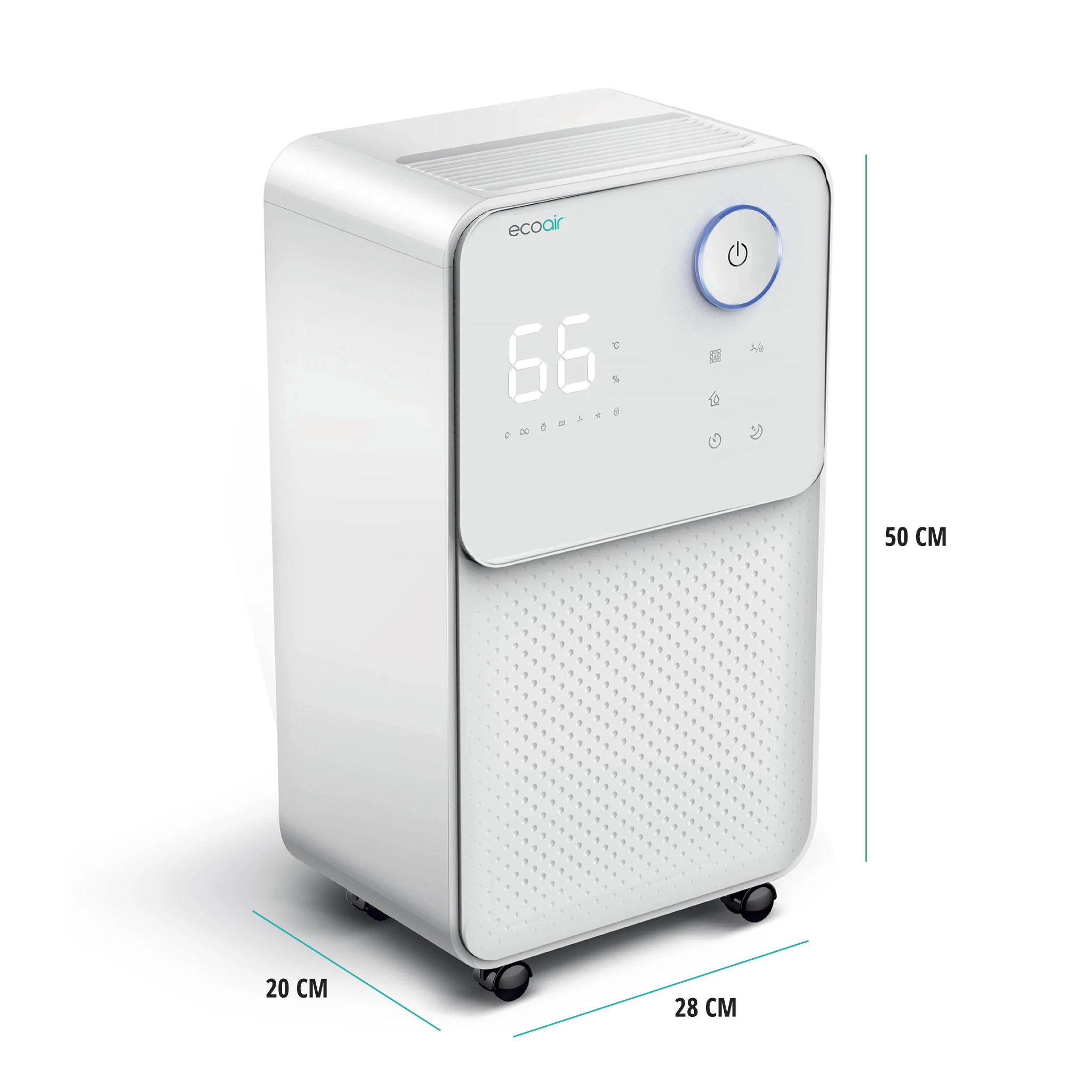 EcoAir Summit S ist ein energiesparender Luftentfeuchter mit einer Leistungsaufnahme von nur 156 Watt. Ein kompaktes Gerät mit einer Entfeuchtungskapazität von 12 Litern pro Tag für Räume bis zu 50 m². Der Luftentfeuchter reinigt gleichzeitig die Luft durch einen 3-lagigen Aktivkohlefilter, einen PET-Filter (Polyethylenterephthalat) und einen Staubfilter. Die Kombination aus Luftentfeuchter und Luftreiniger ist ideal, um ein angenehmes Raumklima zu schaffen. Summit S ist einfach zu bedienen und das übersichtliche Display gibt die Luftfeuchtigkeit in Zahlen und mit einem Farbcode an: Blau: niedrige Luftfeuchtigkeit (< 45 % r.F.) Grün: gute Luftfeuchtigkeit (45 - 65 % r.F.) Rot: hohe Luftfeuchtigkeit (> 65 % r.F.) Die entzogene Feuchtigkeit wird entweder im 2-Liter-Wassertank gesammelt oder über einen Schlauch abgeleitet (kontinuierliche Entwässerung).