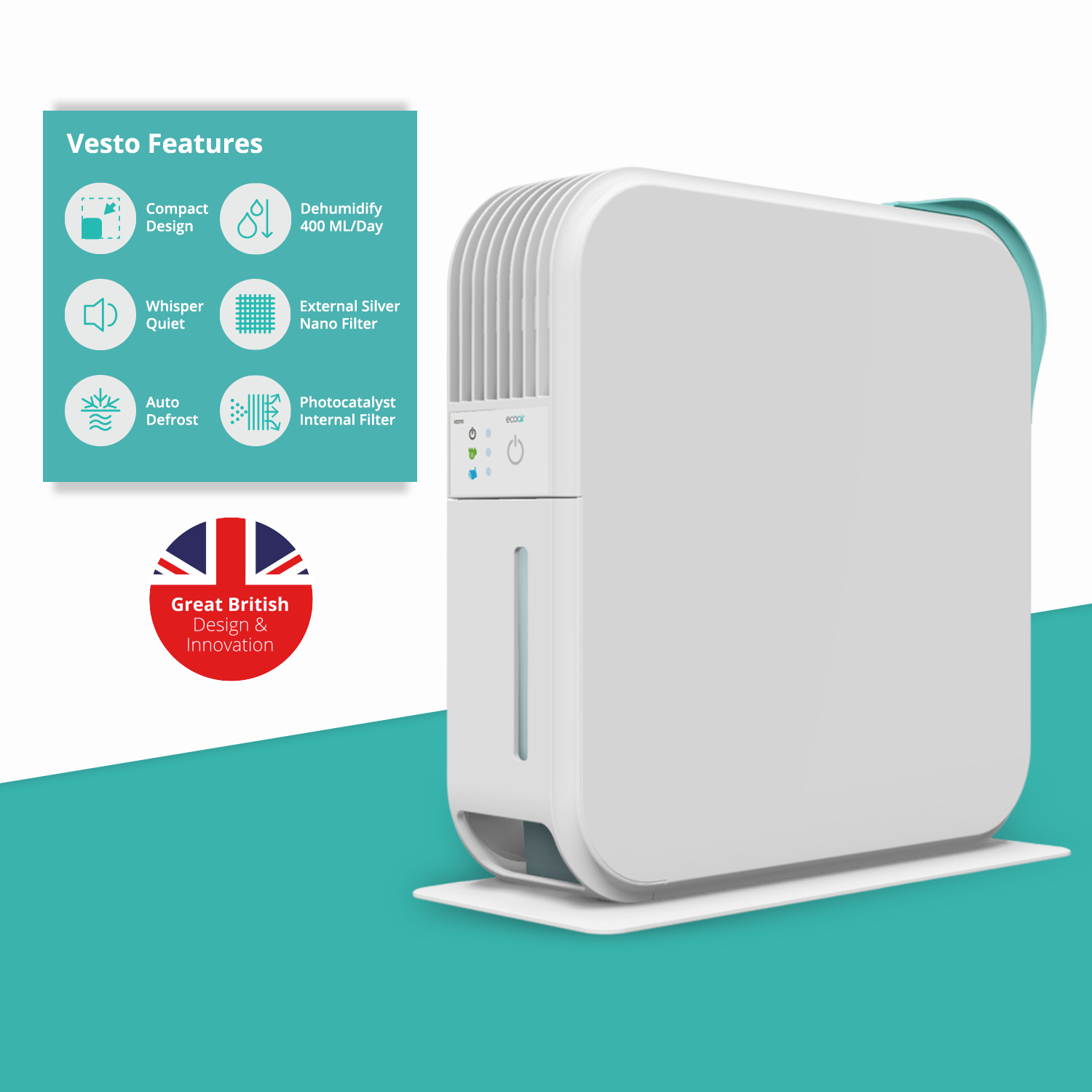 EcoAir Vesto Luftentfeuchter / Luftreiniger ist ein Hybridgerät, das nicht nur die Luftfeuchtigkeit reguliert, sondern auch für gesunde Luft sorgt. Dieser thermoelektrische Luftentfeuchter mit photokatalytischer Luftreinigungstechnologie und antibakteriellem Nano-Silberfilter sorgt für eine gesunde Raumluft in Räumen bis zu 9 m² (Entfeuchtungskapazität 400 ml pro Tag). EcoAir Vesto wurde speziell für die Beseitigung von Feuchtigkeit in kleinen Räumen wie Kleiderschränken, Trockenräumen, Garderoben oder Lagerräumen entwickelt. Er ist einfach zu bedienen und arbeitet geräuscharm. Ist der 800 ml fassende Wassertank voll, schaltet sich der Vesto automatisch ab.