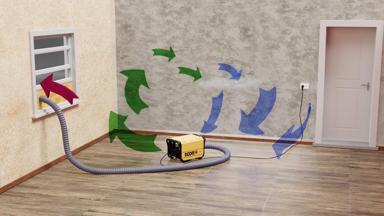 Eine besondere Konstruktion mit drei Entlüftungsöffnungen ( „3-Löcher-Design") und ohne Wassertank: Lufteintritt (Einlass), Austritt trockener Luft und Austritt feuchter Luft (2 Auslässe). Jede der 3 Lüftungsöffnungen verfügt über einen integrierten Flansch an denen optionale flexible Luftkanäle befestigt werden können. Die Feuchtigkeit wird durch das Absorptionsmittel entfernt und als Wasserdampf aus dem Gerät abgeleitet. Die Kondensatableitung (Rohr) hat einen Ø von 80 mm (passend für eine Standard-Klemmringverschraubung).und das Kondenswasser wird nicht als Flüssigkeit abgeleitet, sondern wie bei einem Kondenstrockner mit der Luft ausgeblasen, Das bedeutet, dass kein interner Wassertank entleert werden muss und der Luftentfeuchter rund um die Uhr in Betrieb sein kann. Wichtig für die vollautomatische Entfeuchtung ist die regelmäßige Reinigung des Filters! Der Ø der weiteren Auslässe (Luft in & Luft aus) beträgt 125 mm.