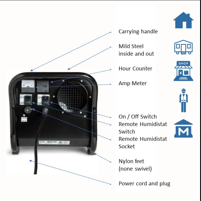 Ecor Pro DH2500 DryFan® Adsorptionstrockner ist im Verhältnis zu seiner sehr hohe Entfeuchtungskapazität von bis zu 35 Litern pro Tag sehr kompakt. Der Trockenmittel-Entfeuchter von Ecor Pro verfügt über die innovative DryFan®-Technologie und ist für Räume bis 185 m² konzipiert. Ideal für die Trocknung von feuchter Luft in beheizten oder unbeheizten Räumlichkeiten wie Wohnräume, Keller, Boote, Loft, Ferienhäuser, Garagen oder Lagerräume (Wartung und Lagerung von Waren), aber auch bei nach Überschwemmungen oder Wasserschäden. Seine Betriebstemperatur liegt zwischen -20 °C und +40 °C und dank seines geringen Gewichtes kann er einfach transportiert oder fix installiert werden. Das Gehäuse des Adsorptionsentfeuchters Ecor Pro DH2500 DryFan® ist robust und er ist in 2 Ausführungen erhältlich: Edelstahl (INOX) oder Gelb. Das „3-Löcher-Design“ (Lufteintritt, Trockenluftaustritt und Feuchtluftaustritt) benötigt keinen Wassertank und ermöglicht einen ununterbrochenen Betrieb (24/7). Rohre oder flexible Schläuche können an den Ausgängen, die mit speziellen Flanschen versehen sind, montiert werden.