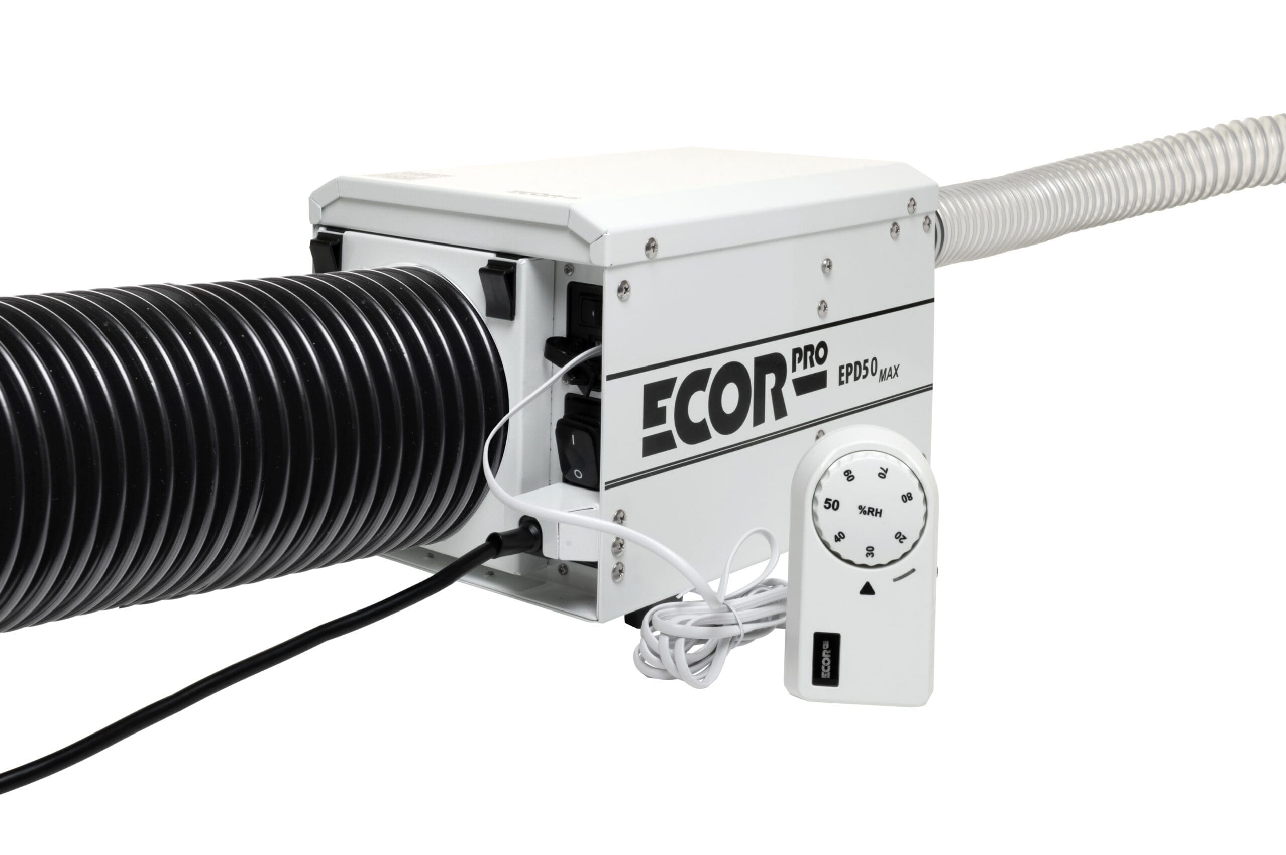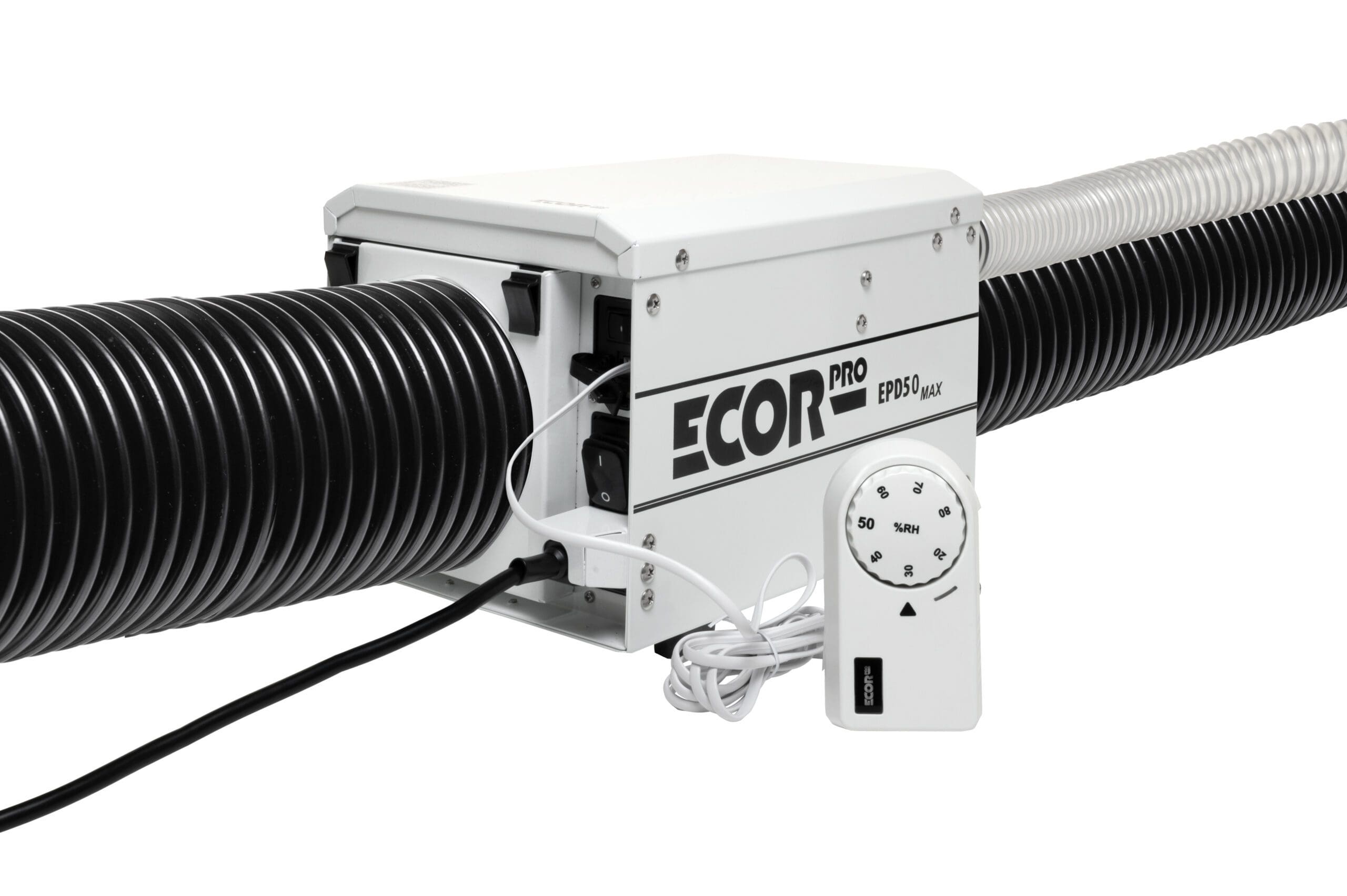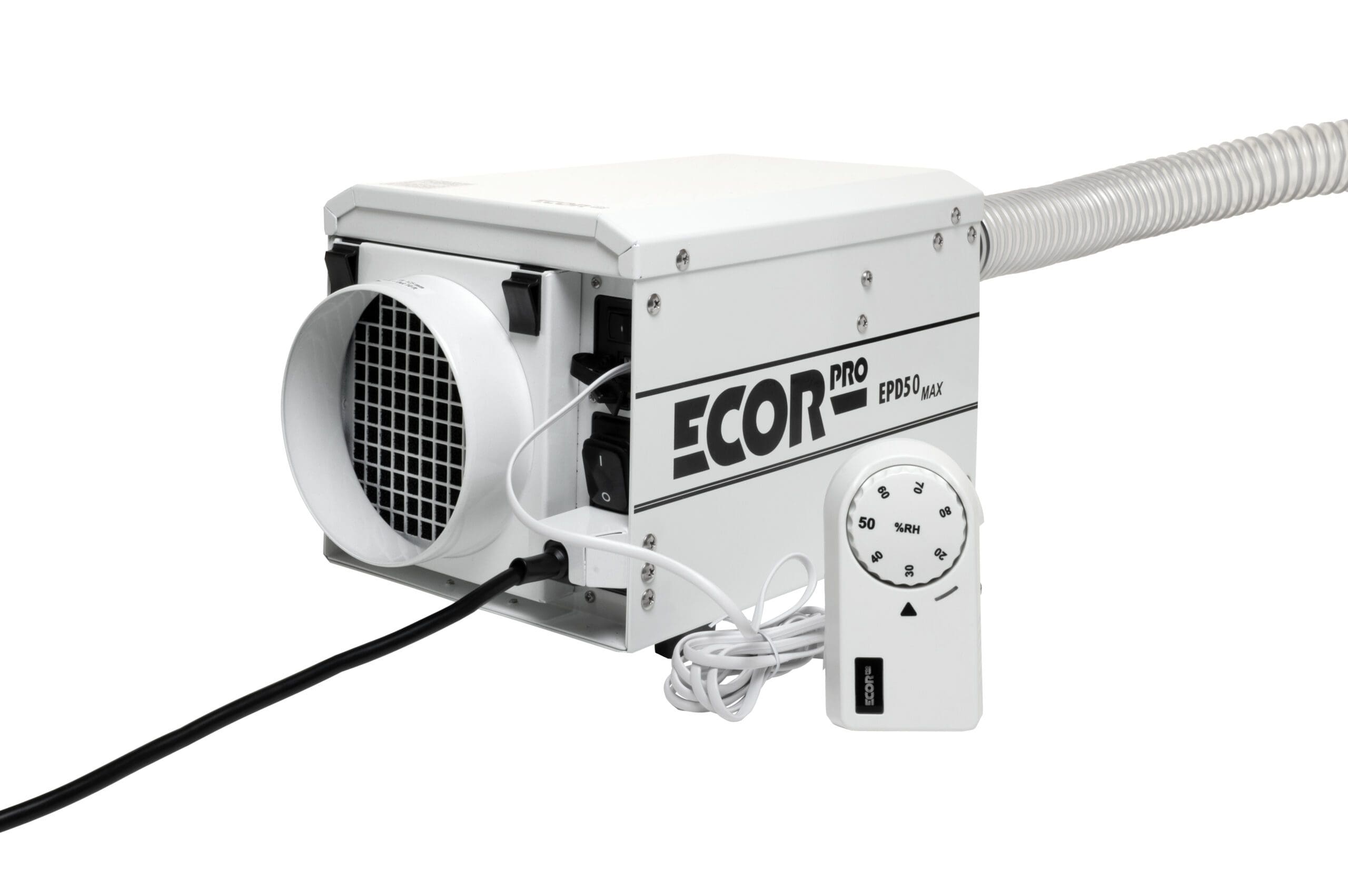 Ecor Pro EPD50-MAX Adsorptionstrockner IP24-klassifiziert und optional mit WLAN-Steuerung Ecor Pro EPD50-MAX Adsorptionstrockner ist ein Semi-PRO Trockenmittel-Luftentfeuchter und sorgt auch bei niedrigen Temperaturen für eine effektive Entfeuchtung – ohne Kondensatbildung. Ob automatischer oder kontinuierlicher Betrieb, dieser Ecor Pro hat eine Entfeuchtungskapazität von 13 Liter pro Tag in Bereichen bis 80 m². Mit dem manuellen, kabelgebundenen EPHUM-I-DRY-Hygrostat lässt sich die gewünschte Luftfeuchtigkeit einstellen und der Adsorptionstrockner senkt die Luftfeuchtigkeit automatisch, bis der eingestellte Wert erreicht ist. Auch eine kontinuierliche Trocknung ist mit diesem EPD50-MAX möglich - rund um die Uhr und ohne Überwachung. Zudem kann der kompakte EPD50-MAX mittels Rohrflanschen an ein Luftsystem angeschlossen werden. Ideal, um Häuser trockenzuhalten, Nebengebäude zu schützen und für die Bootswartung. Der Adsorptionstrockner ECOR PRO EPD50-MAX ist ideal für Anwendungen, bei denen kondensatfreie Trocknung erforderlich ist, auch bei Minusgraden. Die feuchte Luft wird über den Abluftschlauch aus dem Raum abgeführt. Durch den Verzicht auf einen Wassertank und die flexible Montage kann der Luftentfeuchter außer Sichtweite aufgestellt werden und nimmt keinen Platz auf dem Boden ein. Der Luftentfeuchter ist kompakt, stapelbar und kann vielseitig installiert (eingebaut) werden - er eignet sich auch zur Wand- oder Deckenmontage dank Dryfan®. Dryfan® ermöglicht den Betrieb in beliebigen Positionen, sogar "kopfüber". Seine IP24-Klassifizierung ermöglicht auch den Gebrauch in feuchten Bereichen (spritzwassergeschützt). Optional: WLAN-Kontrolle und Steuerung mittels Wi-Fi EPHUM-I-MAX-Remote Control & Monitor. Mit diesem optional erhältlichen WiFi EPHUM-I-MAX Monitor und Controller können Sie die Luftfeuchtigkeit von überall aus regulieren und auch die genauen Messdaten in der App ablesen. Merkmale: Für Bereiche bis Entfeuchtungskapazität 13 Liter / Tag Trockenmittel-Luftentfeuchter Lüfterkapazität: 180 m³/h Kabelgebundener EPHUM-I-DRY-Hygrostat: einfache Bedienung. Verfügt über eine zweifarbige grüne und blaue Statusanzeige im Betrieb oder im Standby-Modus sowie eine dimmbare Hintergrundbeleuchtung für das Ecor Pro-Logo. Schutzart IP24: spritzwassergeschützt Kompaktes Design und lange Lebensdauer (Nutzungsdauer) Temperaturbereich (Betrieb): - 20 °C bis + 40 °C Automatische Reset-Funktion bei eventuellem Stromausfall Serieller RJ11-Anschluss erkennt, ob ein Hygrostat vorhanden ist oder nicht.(Auch verwendet für die im Lieferumfang nicht enthaltene Cloud-Software) 10-PPI-Filter Staubfilter: schützt das Gerät und sorgt für eine gesunde Luftqualität Abluftkanal: Ableitung Kondensat / Feuchtigkeit aus Gerät Stromkabel: Einfach austauschbar für das jeweilige Land (Region), Anschluss an Generatoren oder Austausch bei Beschädigung aufgrund des patentierten Ecor Pro-Designs. Kabellänge 5 Meter Im Lieferumfang enthalten: Ein Standard-Filterhalter EPDF125 Ein-/Aus-Flanschadapter für 125-mm-/5-Zoll-Kanäle EPHUM-I-DRY-Hygrostat mit 2 m/6″ geradem weißem Kabel EPDUCT45x1 40 mm/1,5″ flexibler 1 m/3′ Feuchtigkeitsableitungskanal Optional erhältlich: WLAN-Steuerung und -Überwachung mittels Wi-Fi EPHUM-I-MAX-Remote Control & Monitor