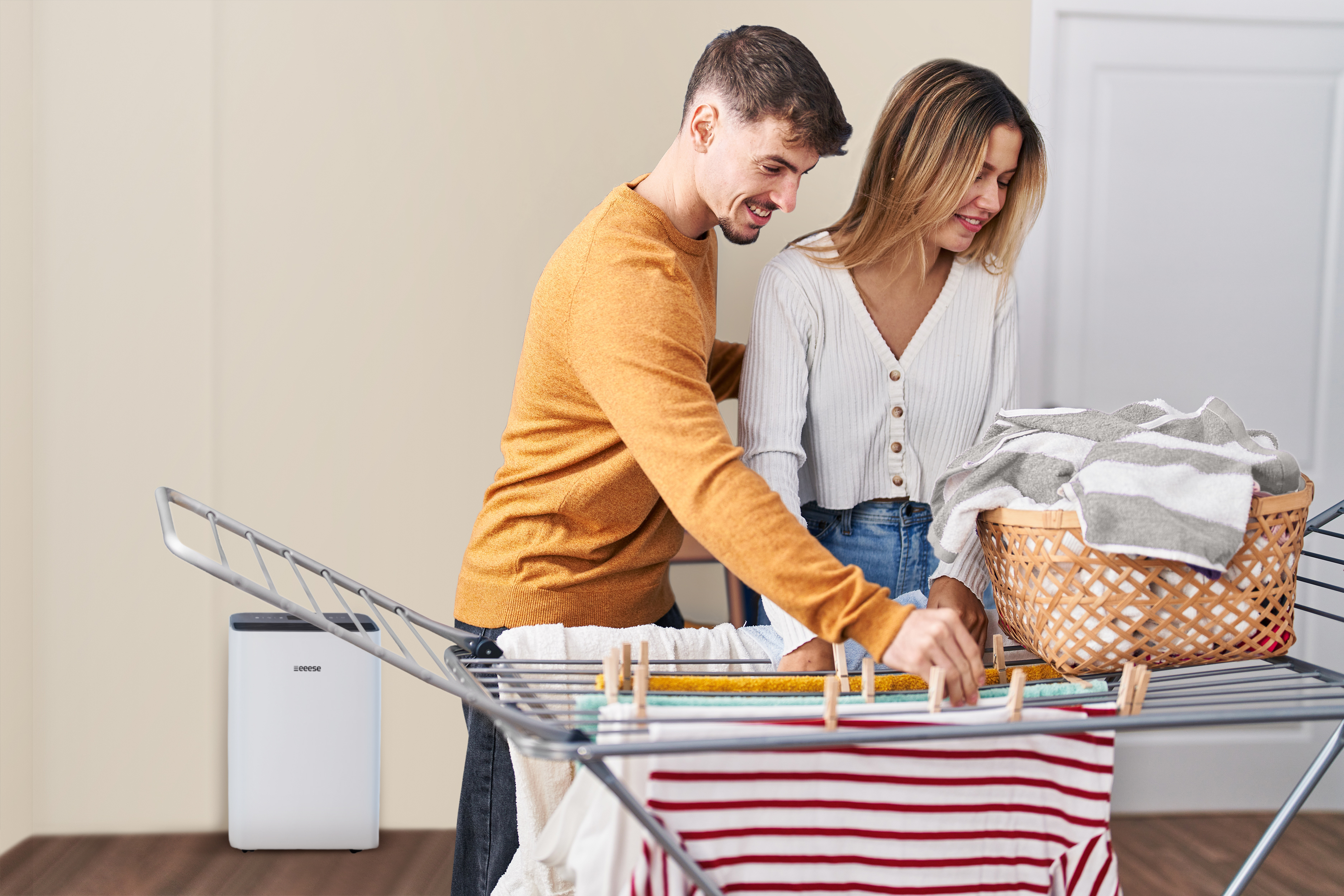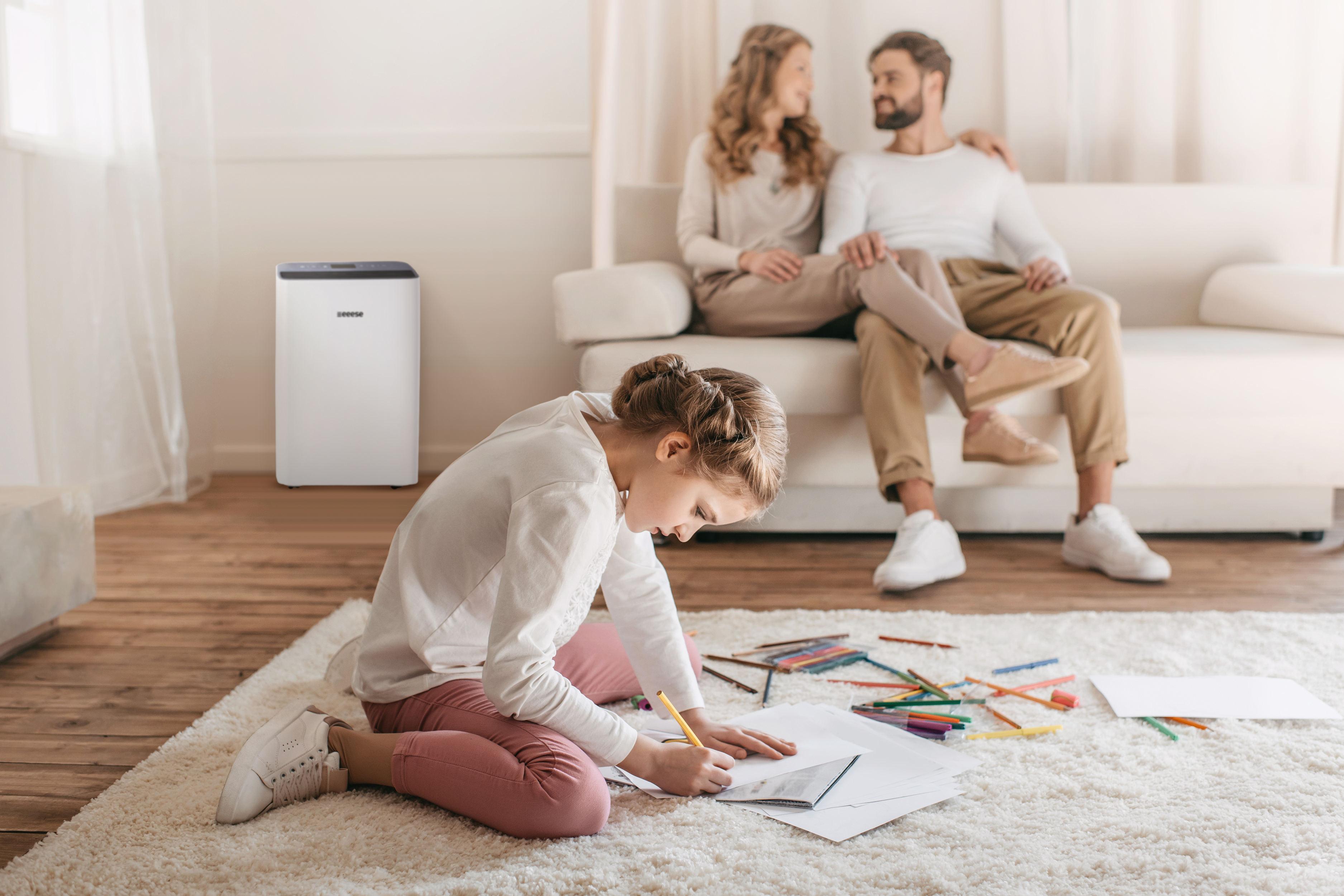 Eeese Emma 20L WiFi Luftentfeuchter ist ein elegantes und kompaktes Gerät, das mit zahlreichen Funktionen ausgestattet ist. Emma verringert die überschüssige Feuchtigkeit in Räumen bis zu 100 m² (20 Liter pro Tag). Der Eeese Luftentfeuchter ist leise und sparsam. Er verbraucht nur 250 Watt. Emma verfügt über ein integriertes WLAN und kann einfach mit einer App auch auf Abstand kontrolliert und programmiert werden. Der optionale HEPA-Filter macht aus Emma ein 2-in-1-Hybrid-Gerät, das sowohl als Luftentfeuchter als auch als Luftreiniger verwendet werden kann. Mit Emmas praktischem Waschtrockner wird Ihre Kleidung besonders schnell trocken, energiesparend und umweltbewusst. Emma hilft Ihnen bei der Regulierung einer gesunden Luftfeuchtigkeit in privaten oder gewerblichen Bereichen.