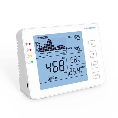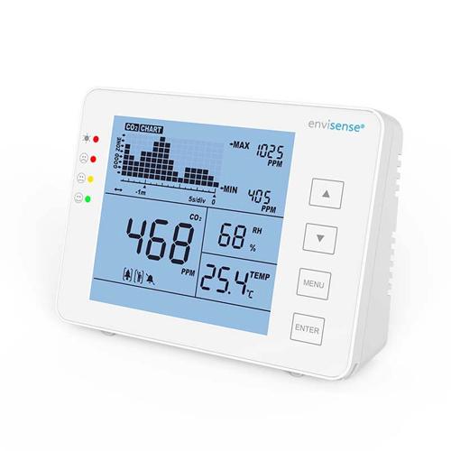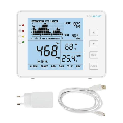Der EnviSense CO2-Monitor sorgt für eine permanente Überwachung des Raumklimas und kontrolliert den CO2-Gehalt, (relative) Luftfeuchigkeit und Temperatur. Bei ungesunden Werten (Innenraumklima) erhalten Sie eine Warnung mittels akustischem Alarm und optischem Ampeleffekt (grün, orange, rot). Das kompakte Messgerät kann an einem beliebigen Ort für Messungen zu Hause, im Büro, in der Schule oder an anderen Standorten verwendet werden. Dank des digitalen Displays haben Sie das Raumklima immer im Blick und wissen, wann es wieder Zeit zum Lüften ist. Konzipiert für Räume bis 100 m² kalibriert sich das Gerät automatisch. Das Kohlendioxid-Messgerät ist weiters mit einem Datenlogger und einem hochwertigen NDIR-Sensor ausgestattet.