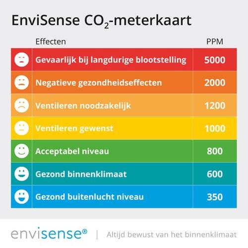 Der EnviSense CO2-Monitor ist eigentlich ein 3-in-1 Messgerät: Er kontrolliert permanent den CO₂-Gehalt, die relative Luftfeuchtigkeit und Temperatur in Räumen bis 100 m². Bei ungesunder Raumluft erhalten Sie einen akustischen und visuellen Alarm (Ampeleffekt: grün, orange, rot). Die gemessenen Daten werden in einem Datenlogger gespeichert und können einfach mithilfe des übersichtlichen und einfach zu bedienenden Display eingesehen werden. Somit haben Sie Ihr Raumklima immer im Blick und können, wenn nötig Maßnahmen ergreifen (lüften). Der kompakte und formschöne Monitor kann überall verwendet werden – Wohnbereich, Büros, Schulen oder anderen Bereichen. EnviSense CO2-Monitor kann auf einen Kasten/Tisch gestellt oder an der Wand befestigt werden. Der EnviSense CO2-Monitor erfüllt die im Baubeschluss beschriebenen Anforderungen und das bedeutet, dass das 3-in-1-Messgerät dauerhaft mit elektrischer Netzspannung betrieben wird (NICHT kabellos) und es sich automatisch kalibriert. Das Messgerät hat ebenfalls einen Messbereich von 0 - 5000 ppm und ist mit 3 Farbcodes versehen: grün für weniger als 800 ppm, gelb für 800 - 1200 ppm und rot für einen CO₂-Wert von 1200 und höher. Selbstverständlich kann der CO₂-Gehalt nach Belieben eingestellt werden. Der integrierte hochwertige NDIR-Sensor sorgt für die höchste Genauigkeit der gemessenen Werte. Beachten bei erstmaliger Verwendung: Wird das Messgerätes zum ersten Mal eingeschaltet, so braucht es einige Zeit, um sich zu kalibrieren. Das Kohlendioxid-Messgerät ist selbstkalibrierend und selbstlernend und wird daher genauer, je länger es verwendet wird (eingeschalten ist). Merkmale: Für Räume bis 100 m² 3-in-1 Messgerät: kontrolliert den CO2-Gehalt, Temperatur und Luftfeuchtigkeit Hochwertiger NDIR-Sensor Datenlogger (historische Daten) Farbige LED-Anzeige (CO2-Ampel): grün, orange oder rot Akustische und visuelle Warnung Automatische und manuelle Kalibrierung Permanter Betrieb - 230 V Stromkabel Anzeige von Datum und Zeit CE-Kennzeichnung Großes und übersichtliches Display Einstellbarer Alarm Mit Kabel (1 m inkl. Eurostecker) Stehend oder Wandbefestigung