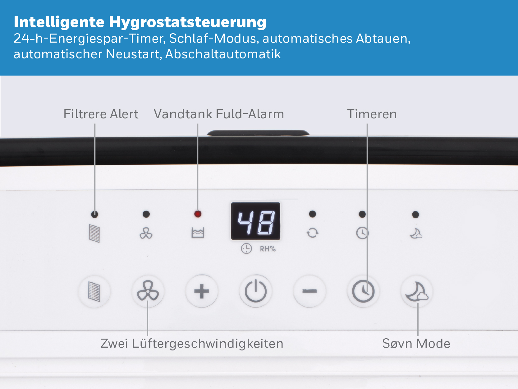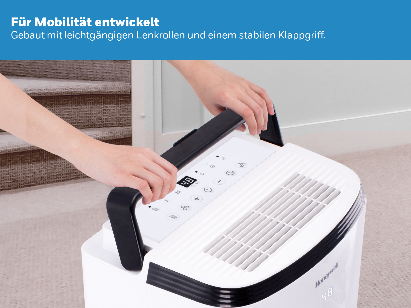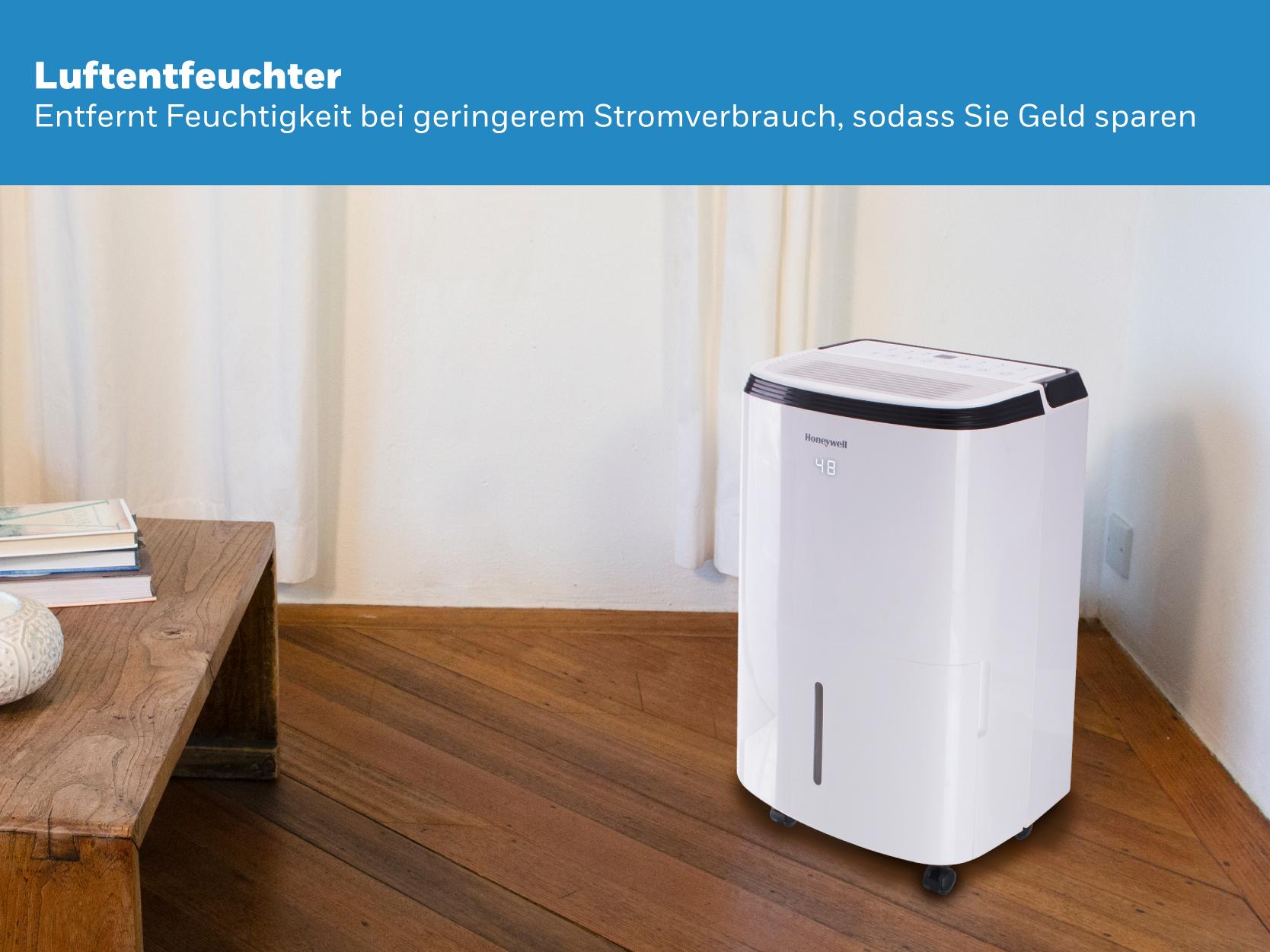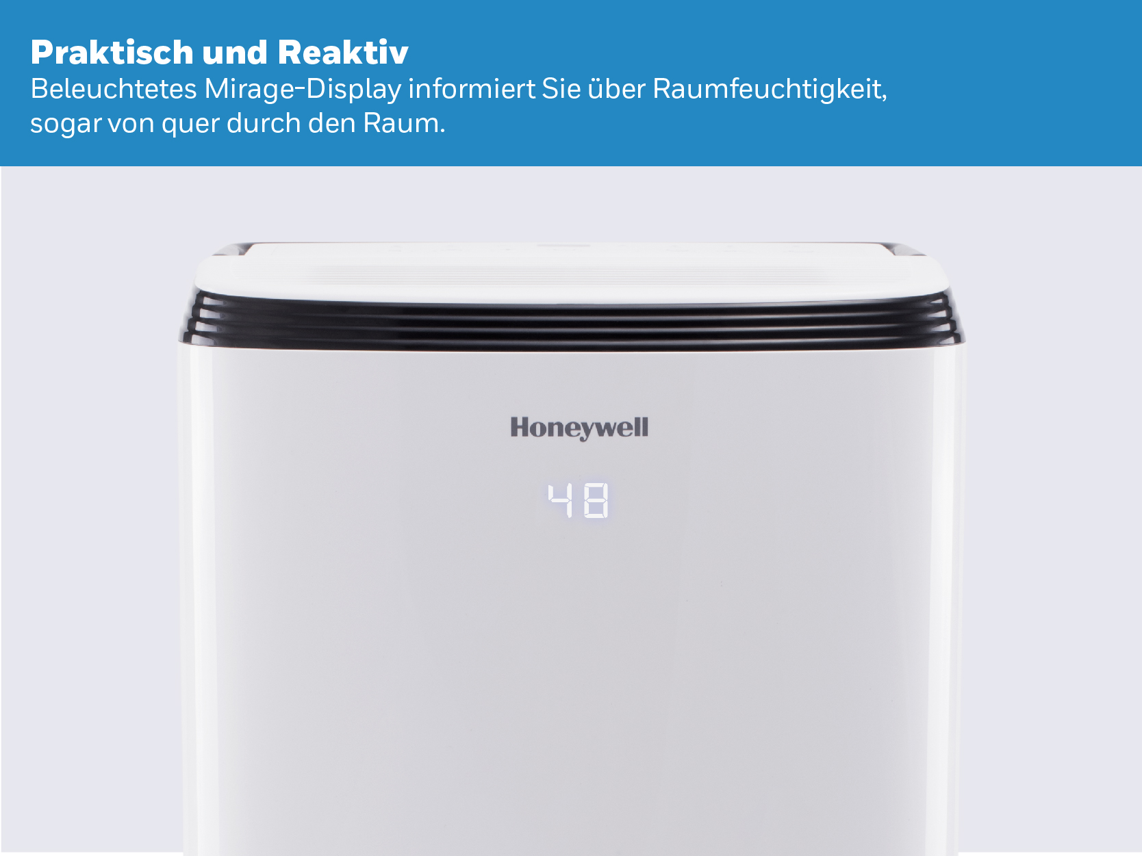 Honeywell TP SMALL 24L Luftentfeuchter - Energy Star® zertifiziert Honeywell TP SMALL 24L Luftentfeuchter ist ein kompakter, leistungsstarker und benutzerfreundlicher Entfeuchter für eine problemlose Feuchtigkeitsregulierung. Er kann einfach an Ihre speziellen Bedürfnisse angepasst werden und reguliert die relative Luftfeuchtigkeit in Räumen bis 120 m², mit einer Entfeuchtungskapazität von 24 Liter / Tag. Mit dem Energy Star Siegel (Energy Star®) werden besonders energieeffiziente Elektrogeräte ausgezeichnet (zertifiziert). Das 'entzogene' Wasser wird in einem Wassertank mit einem Fassungsvermögen von 3,3 Litern aufgefangen. Ist der Tank voll, schaltet sich der Honeywell dank der automatischen Abschaltautomatik aus. Selbstverständlich besteht auch die Möglichkeit eines permanenten Kondensatanschlusses. Das hat den großen Vorteil, dass der Entfeuchter kontinuierlich laufen kann, ohne sich Gedanken um einen vollen Wassertank machen zu müssen. Ideal fürs Erdgeschoss oder in Sommerhäusern. Der benötigte Ablaufschlauch ist im Lieferumfang enthalten. Der Honeywell kann einfach über ein blau hinterleuchtetes LED-Display mit Touch-Bedienelementen, das sich an der Oberseite befindet, gesteuert werden. Sie können die gewünschte Luftfeuchtigkeit manuell zwischen 30 - 90 % in 5%-Schritten einstellen. Der Betrieb des Gerätes kann auch mit der 24-Stunden-Zeitschaltuhr gesteuert werden. Das Gerät weist Sie auch darauf hin, wenn der Staubfilter gereinigt werden muss. Dieser kann einfach entfernt und mühelos unter einem Wasserhahn gereinigt werden. Sie benötigen keine Ersatzfilter. Zur weiteren Ausstattung zählen ein automatischer Feuchtigkeitssensor, eine automatische Abtauung und Abschaltautomatik. Beim Honeywell FP können Sie aus insgesamt 4 Betriebsarten (Modi) wählen: Wäsche-/Trocknermodus (Laundry): Maximale Leistung, um eine schnelle Entfeuchtung zu gewährleisten. Ideal zum Trocknen der Kleidung, aber auch zum Trockenhalten des Waschraums. Normaler-Modus (Dehumidifying): Entfeuchtung des Raums bei geringerer Geschwindigkeit Komfort-Modus (Comfort): Automatische Anpassung der Leistung an die relative Luftfeuchtigkeit im Raum an. Dauerbetrieb (Continuous): Geeignet für Räume, in denen eine kontinuierliche Entfeuchtung bei geringerer Geschwindigkeit mit einem Zielwert von 30 % RH oder weniger erforderlich ist. Honeywell Luftentfeuchter ist mobil und einfach zu transportieren (4 Rollen und robuster Griff). Dieser tragbare Luftentfeuchter hilft Ihnen täglich, Feuchtigkeit aus kleinen bis mittelgroßen Räumen wie Schlafzimmern, Arbeitszimmern, Badezimmern und Wohnzimmern zu entfernen. Er entfernt effektiv Feuchtigkeit aus der Luft und schützt nicht nur Ihre Gesundheit, sondern auch die Inneneinrichtung wie Wände, Kleidung, Vorhänge, Möbel und Geräte vor Schimmel und Mehltau. Merkmale: Energy Star® zertifiziert Für Bereiche bis 120 m² Entfeuchtungskapazität: 24 Liter / Tag Spritzwassergeschützt Einfache Bedienung mittels LED-Display 4 Betriebsarten (Modi) Wäschetrockner-Modus – Effizient und umweltfreundlicher Geräuscharmer Betrieb: maximal 49,5 dB(A) Timer: 24-Stunden-Zeitschaltuhr Abschaltautomatik Automatischer Neustart Automatische Abtauung Wasserbehälter (3,3Liter) Automatisches Abschalten bei vollem Wassertank Möglichkeit eines permanenten Kondensatanschlusses Ablaufschlauch im Lieferumfang enthalten Umweltfreundliches Kältemittel R290 Integrierte Handgriffe und Rollen Filterkontrollanzeige: herausnehmbarer und waschbarer Staubfilter Betriebstemperatur: 5 - 32 °C Feuchtigkeitssensor (Hygrometer): 30 % - 90 % Hergestellt mit 11-stufigen Sicherheits- und Qualitätsprüfungen zum Schutz vor Überhitzung und als Gewährleistung für eine lange und leistungsstarke Nutzungsdauer.
