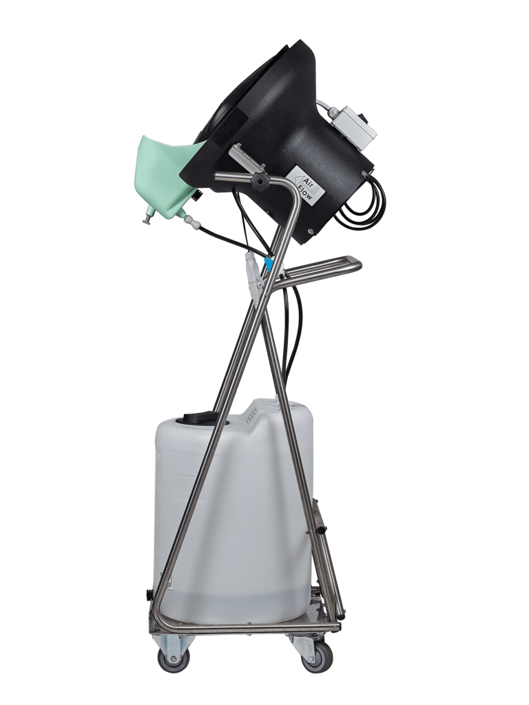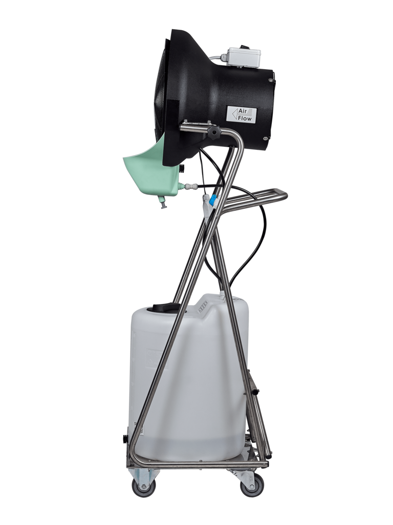 FRANCO UCP M15 Industrieller Luftbefeuchter - mit einer Luftverdrängung von 750 m³/Stunde! FRANCO UCP M15 industrieller Luftbefeuchter und Air-Cooler ist sofort einsatzbereit (Plug&Play). Er ist IP55 klassifiziert (Schutz vor Staub und Strahlwasser), einfach zu transportieren und mit einem Wasserbehälter von 60 Litern ausgestattet. Der FRANCO UCP hat eine Befeuchtungsleistung von 30 Liter pro Stunde (600 - 720 Liter pro Tag) in Räumen bis 3.500 m³. FRANCO UCP M15 ist ein Zentrifugalbefeuchter / adiabatischer Befeuchter und hat eine besonders feine Zerstäubung, die mit Nebel verglichen werden kann. Dank des leistungsstarken Gebläses bleiben keine Tröpfchen zurück und der gesamte Raum wird befeuchtet. Die Regelung der Feuchteabgabe kann durch Anpassung des Ventils vorgenommen werden und der verbesserte Schwimmer lässt sich problemlos abnehmen und einstellen. Der UCP ist ein vielseitiger und leistungsstarker Luftbefeuchter, der mit kleinen, mittleren und großen Ventilatoren kombiniert werden kann. Je nach Kombination kann er als Luftbefeuchter, Verdunstungskühler oder Desinfektionsgerät eingesetzt werden. Das robuste Kunststoffgehäuse sorgt für eine einfache Wartung und ermöglicht den Einsatz in verschiedenen Umgebungen, auch unter schwierigen Bedingungen. Im Vergleich zu herkömmlichen Befeuchtungssystemen mit Düsen ist der FRANCO weniger empfindlich vor Kalk- und Schmutzablagerungen. Die Wartung und Reinigung sind einfach - die Pumpe ist mit einer Schnellkupplung befestigt, die bei Wartungsarbeiten einfach entfernt werden kann. Anwendungsbereiche: Für die Befeuchtung von Brutkästen und Brutanlagen, die Kühlung von Stallungen und Zuchtbetrieben. Weiters zur Aufrechterhaltung eines konstanten Feuchtigkeitsniveaus in Umgebungen wie Kühlräumen, Papierindustrie, Tabak-, Holz- und Textilbetrieben und ATUs. In Kombination mit einer Luftumwälzung wird er in Gewächshäusern, Pilzfarmen, Keimräumen, bei der Konservierung von Obst und Gemüse vor Ort sowie bei der Verteilung von Sprühflüssigkeiten eingesetzt. Merkmale: Für Räume bis 3.500 m³ Adiabatischer Befeuchter mit einer Befeuchtungsleistung von 30 Liter / Stunde (720 Liter / Tag) Zentrifugal-Zerstäuber (Niederdruck) mit Motor-Gebläse Air Flow 750 m³/h Auch für gekühlte Bereichen Produziert sehr feinen Nebel Adiabatischer Befeuchter / Zentrifugalbefeuchter IP55 Schutzklasse: Schutz vor Staub und Strahlwasser Wasserdruck von 2 bis 6 Atmosphären ist ausreichend Einfach zu transportieren Ausgerüstet mit einer Umwälzpumpe Wassertank des Verneblers: 3/8" Schnellkupplung Wasserablass des Wasserbehälters: mittels Kupplung Niedrige Installationskosten (Plug & Play) Einfaches Service und Wartung Entleeren Sie den Wassertank nach dem Gebrauch immer vollständig, um die Entstehung von Legionellen zu verhindern.