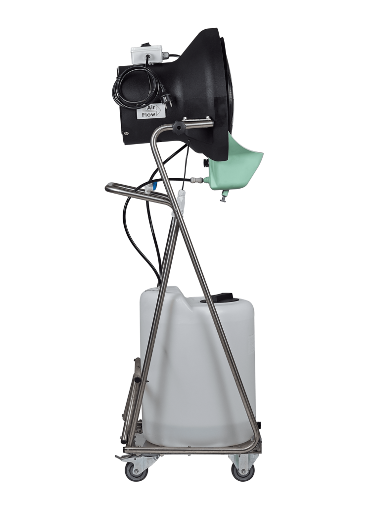 FRANCO UCP M25 Industrieller Luftbefeuchter - mit einer Luftverdrängung von 1.800 m³/Stunde! FRANCO UCP M25 industrieller Luftbefeuchter und Air-Cooler ist sofort einsatzbereit (Plug&Play). Er ist IP55 klassifiziert (Schutz vor Staub und Strahlwasser), einfach zu transportieren und mit einem Wasserbehälter von 60 Litern ausgestattet. Der FRANCO UCP hat eine Befeuchtungsleistung von 30 Liter pro Stunde (600 - 720 Liter pro Tag) in Räumen bis 3.500 m³. FRANCO UCP M25 ist ein Zentrifugalbefeuchter / adiabatischer Befeuchter und hat eine besonders feine Zerstäubung, die mit Nebel verglichen werden kann. Dank des leistungsstarken Gebläses bleiben keine Tröpfchen zurück und der gesamte Raum wird befeuchtet. Die Regelung der Feuchteabgabe kann durch Anpassung des Ventils vorgenommen werden und der verbesserte Schwimmer lässt sich problemlos abnehmen und einstellen. Der UCP ist ein vielseitiger und leistungsstarker Luftbefeuchter, der mit kleinen, mittleren und großen Ventilatoren kombiniert werden kann. Je nach Kombination kann er als Luftbefeuchter, Verdunstungskühler oder Desinfektionsgerät eingesetzt werden. Das robuste Kunststoffgehäuse sorgt für eine einfache Wartung und ermöglicht den Einsatz in verschiedenen Umgebungen, auch unter schwierigen Bedingungen. Im Vergleich zu herkömmlichen Befeuchtungssystemen mit Düsen ist der FRANCO weniger empfindlich vor Kalk- und Schmutzablagerungen. Die Wartung und Reinigung sind einfach - die Pumpe ist mit einer Schnellkupplung befestigt, die bei Wartungsarbeiten einfach entfernt werden kann. Anwendungsbereiche: Für die Befeuchtung von Brutkästen und Brutanlagen, die Kühlung von Stallungen und Zuchtbetrieben. Weiters zur Aufrechterhaltung eines konstanten Feuchtigkeitsniveaus in Umgebungen wie Kühlräumen, Papierindustrie, Tabak-, Holz- und Textilbetrieben und ATUs. In Kombination mit einer Luftumwälzung wird er in Gewächshäusern, Pilzfarmen, Keimräumen, bei der Konservierung von Obst und Gemüse vor Ort sowie bei der Verteilung von Sprühflüssigkeiten eingesetzt. Merkmale: Für Räume bis 3.500 m³ Adiabatischer Befeuchter mit einer Befeuchtungsleistung von 30 Liter / Stunde (720 Liter / Tag) Zentrifugal-Zerstäuber (Niederdruck) mit Motor-Gebläse Air Flow 1.800 m³/h Auch für gekühlte Bereichen Produziert sehr feinen Nebel Adiabatischer Befeuchter / Zentrifugalbefeuchter IP55 Schutzklasse: Schutz vor Staub und Strahlwasser Wasserdruck von 2 bis 6 Atmosphären ist ausreichend Einfach zu transportieren Ausgerüstet mit einer Umwälzpumpe Wassertank des Verneblers: 3/8" Schnellkupplung Wasserablass des Wasserbehälters: mittels Kupplung Niedrige Installationskosten (Plug & Play) Einfaches Service und Wartung Entleeren Sie den Wassertank nach dem Gebrauch immer vollständig, um die Entstehung von Legionellen zu verhindern.