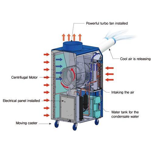 Der WELTEM SC 32000 Spot Cooler – ein mobiles und leistungsstarkes Industrie-Klimagerät für direkte Kühlung und Ventilation Der mobile Weltem SC 32000 Spot Cooler ist ein leistungsstarkes Industrie-Klimagerät, ist sofort einsatzbereit und sorgt direkt für eine effiziente Abkühlung wo es nötig. Mit einer Kühlleistung von 9,4 kW eignet er sich besonders für Einsatz in gewerblichen und industrielle Bereichen (Räume bis zu 100 m²), bei denen eine leistungsstarke Punktkühlung erforderlich ist. Die Regelung erfolgt mit einem Punktabkühlen-Thermostat. Selbstverständlich kann der Weltem SC 32000 auch als Raumkühler verwendet werden. Er regelt seinen Betrieb automatisch und die integrierte Kondensationspumpe sorgt für einen permanenten Abfluss des Kondenswasser. Zur weiteren Ausstattung gehört eine benutzerfreundliche Steuereinheit mit einer Selbstdiagnosefunktion. Eine eventuelle Störung wird mittels Alarmlicht und Code auf dem Bedienungspanel angezeigt und automatisch (selbständig) gelöst – falls Hitze und Feuchtigkeit zu einem Problem werden. Gezielte Kühlung genau dort wo Sie es benötigen – im Innen- oder Außenbereich. Der Weltem SC 83000 ist einfach zu transportieren, funktioniert autark und sorgt direkt für eine effiziente Abkühlung und Regelung der Luftfeuchtigkeit. Anwendungsbereiche sind beispielsweise Lagerhallen, Werkstätten, Prozesskühlung, Gaststätten, Schiffe, Großküchen, bei Sportveranstaltungen, Serverräume, Flugzeughangar, Ausstellungsräume, Katastrophenhilfe oder Industriegebäuden – für den professionellen Gebrauch bei Hitze und Feuchtigkeit, unmittelbar dort, wo Spot-Cooling benötigt wird und nicht der gesamte Bereich gekühlt werden muss. Dieses flexible Weltem Spot-Kühl-/Klimagerät hilft auch bei thermischen Problemen in Krankabinen oder mobilen Units. Merkmale: Leistungsstarke und autarke Profi-Klimaanlage Für Räume bis 100 m² Kühlleistung von 9.400 Watt (9,4 kW) Sofort einsetzbare Kühlung und Belüftung Gezielte Kühlung im Innen- und Außenbereich Integrierte Kondensationspumpe Permanente Ableitung des Kondensat (Wasser) Einfache Bedienung (Control-Panel) Mobil, mit 4 robusten Rollen Keine Installationsarbeiten – spart Zeit und Kosten Regelbarer Kaltluftstrom Kühlung erfolgt mit mehreren Luftschläuchen Gleichzeitige Kühlung mehrerer geschlossener Räume Verbessert die Arbeitsbedingungen Erhöht die Produktivität Hohe Kühlleistung auch bei großen Entfernungen Selbstdiagnosefunktion