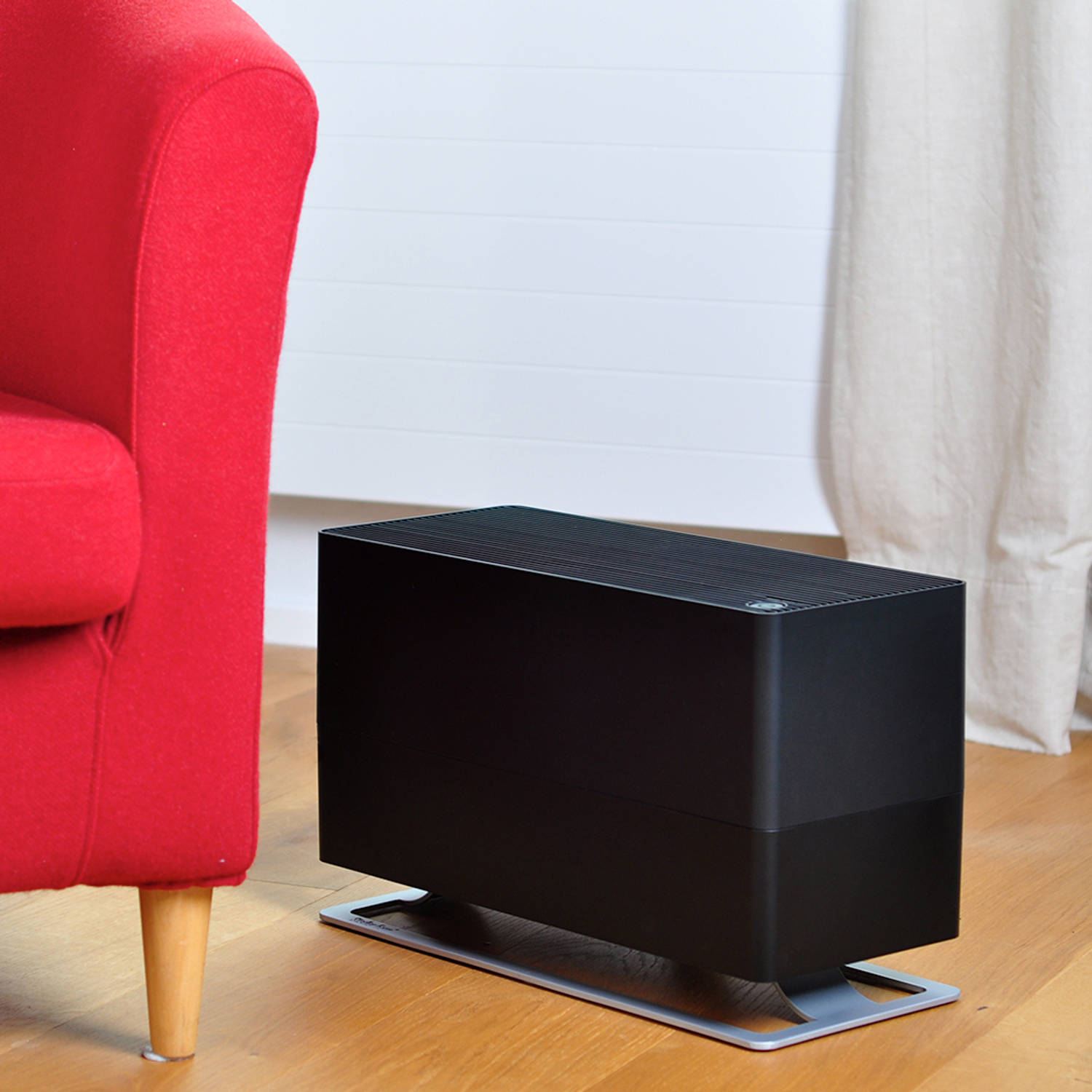 Stadler Form Oskar Big Luftbefeuchter - der große wirtschaftliche Kaltwasser-Verdunster Stadler Form Oskar Big Luftbefeuchter passt wie seine kleinen Geschwister mit seinem kubischen Design bei jedem Interieur. Big Oskar befeuchtet geräuscharm Räume bis 100 m² mit einer Befeuchtungskapazität von 0,6 Liter / Stunde und sorgt mit einem niedrigen Stromverbrauch für eine gesunde Raumluft. Das integrierte Hygrostat kontrolliert und reguliert die präzise Befeuchtung. Ist der Tank leer, schaltet Oskar sich automatisch aus. Dank der LEDs, die gedimmt oder ausgeschaltet werden können, kann der Luftbefeuchter auch während der Nacht verwendet werden, ohne Ihren Schlaf zu stören. Der integrierte Duftspender (Aromafach) ermöglicht den Gebrauch Ihres Lieblingsduftes (ätherische Öle) für ein angenehmes Wohlfülklima und die Memofunktion erinnert Sie an den Filterwechsel. Aufgrund der einzigartigen V4-Filter-Technologie ist und seinem 6-Liter fassenden Wassertank ist er ideal für große Räumlichkeiten. Die Stadler Form Water Cube™ sorgt für eine optimale Hygiene in Ihrem Luftbefeuchter und verlängert auch seine Lebensdauer. Funktionsweise: Kaltwasser Befeuchter erhöhen die Luftfeuchtigkeit durch natürliche Verdunstung von Wasser und sorgen für eine beständige Luftfeuchtigkeit. Kaltwasserverdampfer arbeiten sehr energieeffizient und leise und verursachen keinen weißen Niederschlag (Kalkablagerungen) im Raum. Anwendungsbereiche: private, aber auch gewerbliche Räume bis 100 m² wie Schlaf- Kinderzimmer, Büro oder Wohnzimmer. Merkmale: Für Räume bis 100 m² Kaltwasser-Luftbefeuchter Befeuchtungskapazität: 0,60 Liter / Stunde Luftumwälzung: 165 m³ / h V4-Filter Technologie Leistungsstufen: 2 Leistungsaufnahme: 8 - 32 Watt Geräuschpegel: 25 - 46 dB(A) Abschalt-Automatik Wassertank: 6 Liter Automatische Abschaltung bei leerem Tank Regulierbare Befeuchtung Anzeige Wasserstand und Filterwechsel Nachtmodus: Licht dimmen oder ausgeschalten Integriertes Aromafach (ätherische Öle) Design by Matti Walker (CH) Standardlieferumfang: Oskar Big + 4 Basic Filter + 1 Water Cube™