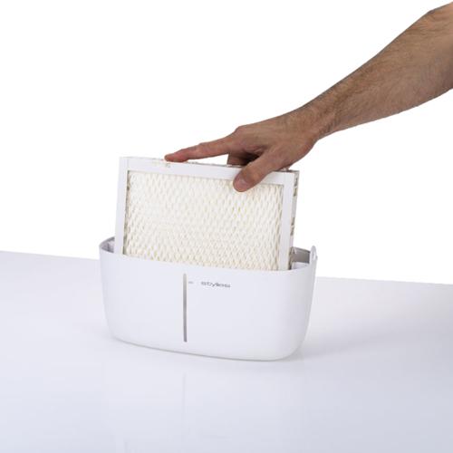 Stylies Alaze Luftbefeuchter ist ein kompakter und geräuscharmer Kaltwasserverdunster, der die Raumluft auf eine natürliche Weise (Verdunstung von kaltem Wasser) befeuchtet. Außerdem filtert der Stylies Alaze kleine schwebende Partikel wie Staub oder Pollen aus der Luft. Konzipiert für Räume bis 40 m² (110 m³), mit einer Befeuchtungsleistung von 0,28 Liter pro Stunde (D.A.S.T.- Technologie) ist dieser Kaltwasserverdunster ideal für Ihr Wohnzimmer, Schlafzimmer, Kinder- oder Babyzimmer. Der integrierte Hygrostat kontrolliert und steuert die gewünschte Luftfeuchtigkeit. Zur weiteren Ausstattung gehören der 3 Liter Wassertank und die antibakterielle Filterkassette. Der Stylies Kaltwasser-Befeuchter ist einfach zu reinigen und warten. DtGV Testsieger im Bereich Luftbefeuchter (Deutsche Gesellschaft für Verbraucherstudien)