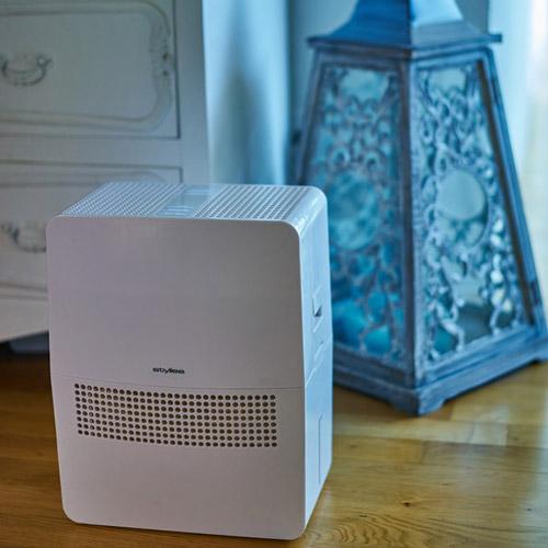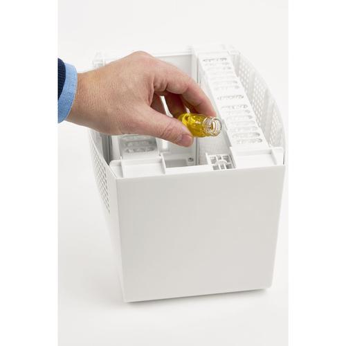Stylies Helos Luftbefeuchter mit Kaltvernebelungs- und Luftreinigungsfunktion befeuchtet und reinigt die Luft in Räumen bis 45 m², mit einer Befeuchtungskapazität von 0,3 Liter / Stunde. Dieser Kaltwasser-Verdunster arbeitet fast geräuschlos und filtert mithilfe der antibakteriellen Filterkassetten auch Pollen und Schmutzpartikel aus der Luft. Stylies Helos ist ideal für Schlaf-, Kinderzimmer oder Büro - sowohl für den privaten als auch gewerblichen Einsatz. Zur weiteren Ausstattung gehören ein Wasserbehälter (4 Liter), Zeitschalter (Timer), integrierter Hygrostat, Nachtmodus und Duftbehälter. Designed by Fabian Zimmerli / Made in Switzerland