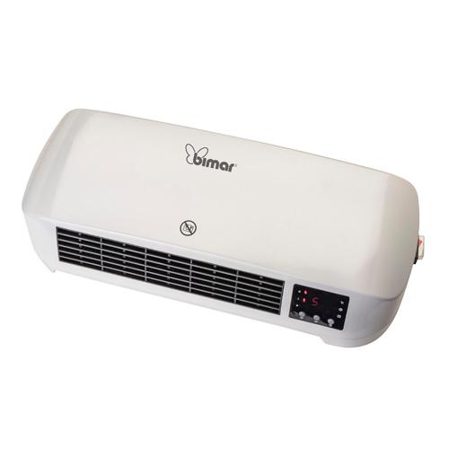 Bimar HP090 Keramik-Heizlüfter zur Wandmontage Der keramische Heizlüfter Bimar HP090 sorgt mit seinem PTC-Keramik-Heizelement für eine rasche und wohlige Wärme in Räumen bis 25 m² (65 m³). Ausgestattet mit 4 Funktionen - Standby / Ventilator / ECO-Heizung (1000 W) / Rapid (2000 W) (Heizen) kann er ganzjährigen verwendet werden. Während der kalten Jahreszeit als Heizung und an warmen Tagen als Ventilator. Der regelbare Thermostat ist einstellbar für eine Raumtemperatur von 10 - 49 °C und die Schutzklasse IP22 ermöglicht auch eine Verwendung dieser keramische Zusatzheizung in Nassbereichen (Badezimmer). Bimar HP090 Keramik Wandheizlüfter ist zudem mit einem Überhitzungsschutz und einer automatischen Abschaltfunktion bei offenem Fenster (Fenstersensor) bestückt. Für noch mehr Komfort sorgt das elektronische Bedienfeld mit LED Beleuchtung, die Fernbedienung und die Zeitschaltuhr mit ON/OFF Timer (1-12 Stunden). Merkmale: Für Räume bis 25 m² (65 m³) Keramischer Wandheizlüfter mit PTC-Keramik-Heizelement 2 Heizmodi: ECO / RAPID Leistungsaufnahme: 1000 / 2000 Watt 4 Funktion: Standby / Fan / ECO-Heizung (1000 W) / Rapid (2000 W) (Heizen) Für Nassbereiche: IP22 Klassifizierung Max. Leistung 2000 Watt Elektronisches Bedienfeld mit LED-Beleuchtung Fernbedienung Ventilatorfunktion Regelbarer Thermostat (Kontrolle der Raumtemperatur) Überhitzungsschutz Fenstersensor mit Abschaltvorrichtung Zeitschaltuhr (ON/OFF): 1 - 12 Stunden Inklusive Wandmontage-Set