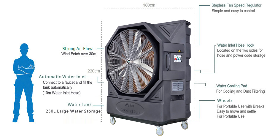 Ya Suh Dar M502-COOL Verdunstungskühler ist ein energiesparender, mobiler, adiabatischer Luftkühler für den gewerblichen Einsatz. Das Plug & Play-Gerät sorgt für angenehme Temperaturen in Fabriken, Industrie- und Produktionsbereichen, Restaurants oder Hotels. Geeignet für Flächen bis 500 m² mit einer Luftumwälzung von 48.000 m³ / Stunde. Dieses Gerät eignet sich für die Kühlung von Innen- und Außenbereichen.