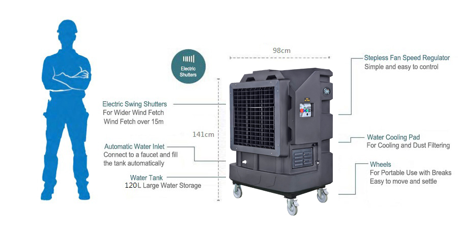 Ya Suh Dar M802-COOL Verdunstungskühler ist ein mobiler, adiabatischer Luftkühler für den gewerblichen Einsatz. Dieses Gerät ist Teil der Ya Suh Dar-Serie und eignet sich besonders für die Kühlung von Innen- und Außenbereichen. Das Plug & Play-Gerät sorgt für angenehme Temperaturen in Fabriken, Industrie- und Produktionsbereichen, Restaurants oder Hotels. Geeignet für Flächen bis 160 m² mit einer Luftumwälzung von 18.000 m³ / Stunde. Ein adiabatischer Kühler kühlt nicht nur die Raumluft, sondern filtert auch Staub und Schmutz.