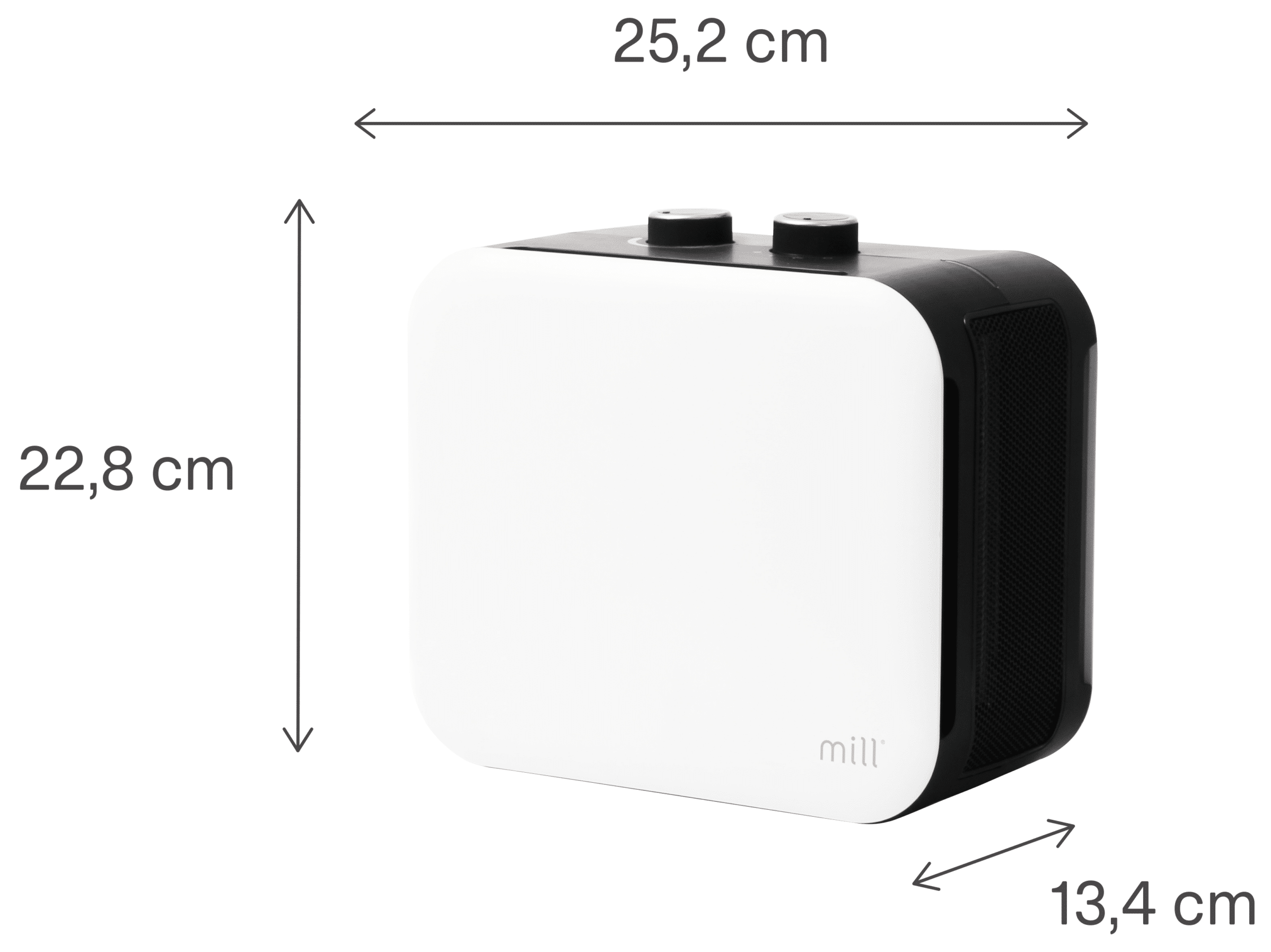 Mill CUS1800MEC Elektroheizung - Leistungsstarker Heizlüfter im atemberaubenden Design Mill CUS1800MEC Elektroheizung sorgt trotz seines minimalistischen skandinavischen Stils für eine angenehme und rasche, wohlige Wärme in Bereichen bis 30 m². Der Mill PTC-Heizlüfter verfügt über zwei Leistungsstufen (1200 und 1800 Watt) und ein leistungsstarkes Gebläse für eine schnelle Wärmeverteilung. Die Bedienung ist kinderleicht - auch dank des manuell regulierbaren Thermostats. Der Überhitzungsschutz (die Heizung schaltet sich bei Überhitzung ab) und der Kippschutz-Schalter (schaltet sich automatisch aus, wenn das Gerät umkippt) gewährleisten zusätzliche Sicherheit. Die Zusatzheizung von Mill ist nicht nur mit einem leistungsstarken Motor ausgestattet, sondern auch mit einem PTC-Heizelement. Vorteil eines PTC-Heizelementes ist die niedrige Oberflächentemperatur, wodurch weniger Staub verbrannt wird. Mill Elektro-Heizlüfter sind sehr effizient und können ganzjährig verwendet werden. An kalten Tagen sorgt er für schnelle und angenehme Wärme in kleinen und großen Räumen - überall dort, wo zusätzliche Wärme benötigt wird. Der kompakte Mill CUS lässt sich leicht transportieren und aufbewahren. Merkmale: Bereiche bis 30 m² PTC-Heizelement Niedrige Oberflächentemperatur 2 Leistungsstufen: 1200 / 1800 Watt Thermostat: mechanisch einstellbar Leistungsstarkes Gebläse Einfache Bedienung Kompakte Größe Kippschutzschalter Überhitzungsschutz