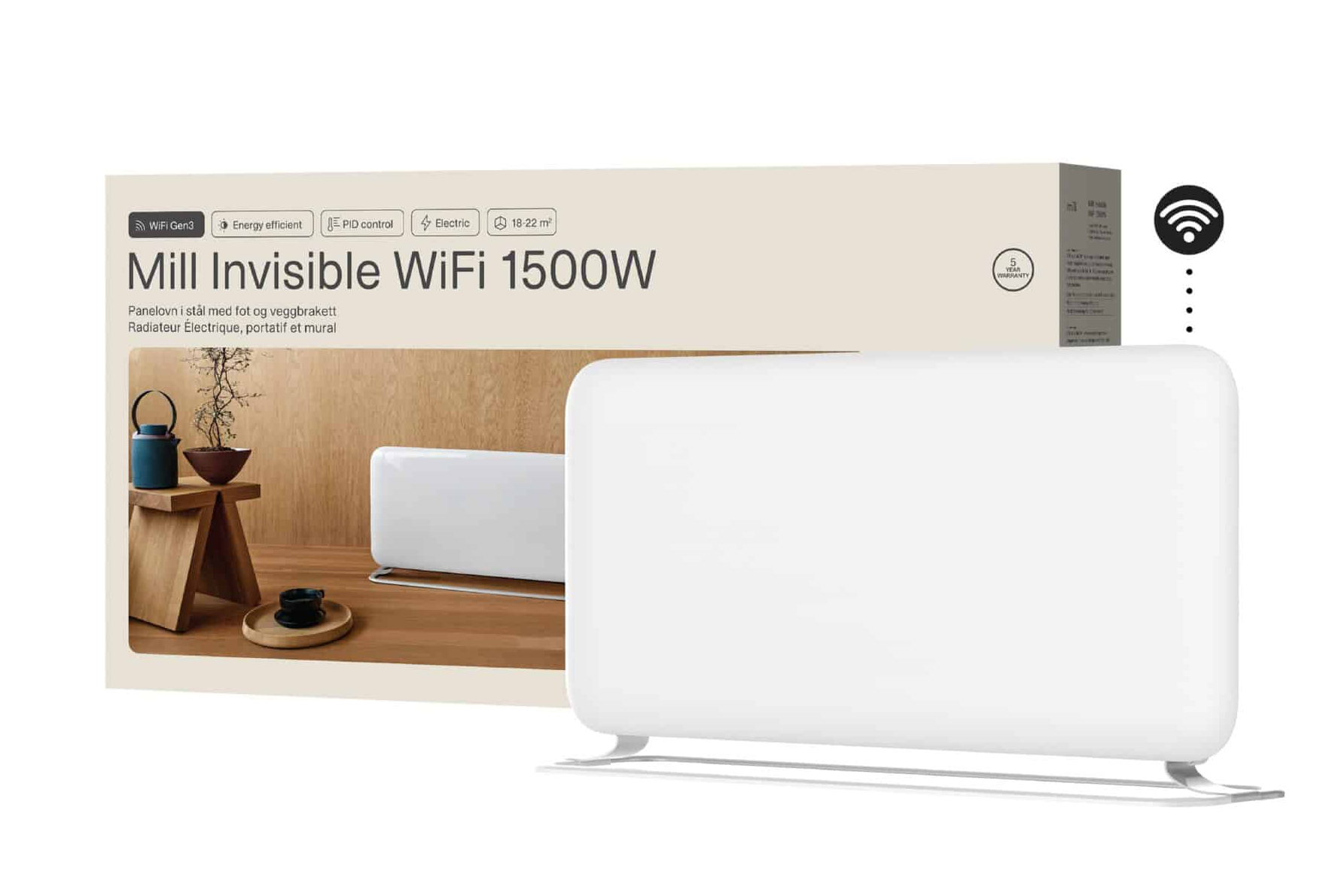Mill PA1500WIFI4 A Heizpaneel - unsichtbare WLAN-Heizung der 4. Generation mit Standfuß Mill PA1500WIFI4 A Heizpaneel ist eine Stahlflächenheizung und sorgt mit einer Leistung von 1500 Watt für eine angenehme Wärme in Räumen bis 22 m². Dank mitgeliefertem Standfuß kann das Gerät flexibel freistehend genutzt oder an der Wand montiert werden. Das elegante skandinavische Design mit sanft gebogener Front sorgt für eine dezente, gleichmäßige Wärme. Dank IPX4‑Klassifizierung ist der Heizkörper auch ideal für Badezimmer geeignet. Dieses Heizpaneel der 4. Generation hält dank Mill PID Wattage Tech™ und Predictive Heating™ die Temperatur besonders konstant und optimiert gleichzeitig den Energieverbrauch.. Die Bedienung erfolgt manuell über ein stilvolles Touch-Bedienfeld oder über WiFi (Millheat-App). Mit der Millheat‑App steuern Sie Ihre Heizung bequem per Knopfdruck – weltweit und jederzeit. Die kostenlose App lässt sich einfach auf Smartphone oder Tablet installieren und ermöglicht die zentrale Kontrolle mehrerer Heizgeräte. Kurze Übersicht der intelligente Funktionen: Mill Predictive Heating™: lernt Ihr Heizverhalten und heizt vorausschauend Mill PID Wattage Tech™: präzise Temperaturregelung bei minimalem Energieverbrauch Wattage Cap (Watt-Begrenzung) & ECO‑Modus: reduziert den Stromverbrauch um bis zu 30 % Komfortfunktionen: Fenster-offen-Erkennung, Kindersicherung, kommerzielle Sperre Breite Smart‑Home‑Kompatibilität: Matter, Zigbee 3.0, Homey, Google Home, Alexa, Apple Home Open-Window-Funktion: Sobald die Temperatur im Raum plötzlich sinkt, stoppt das Heizpaneel mit der Erwärmung. Steigt die Temperatur innerhalb von 15 Minuten um mindestens drei Grad an, beginnt der Heizkörper wieder zu heizen. Bedarfsgerechtes Heizen - der Schlüssel zur Energieeinsparung! Das Heizpaneel wurde mit einem ausgeklügelten Algorithmus ausgestattet, der es ihm ermöglicht, den Temperaturanstieg bzw. -abfall im Raum zu erkennen und analysieren. Hierdurch 'lernt' der Heizkörper und weiß, wann es Zeit ist, sich einzuschalten, damit die gewünschte Temperatur zur eingestellten Zeit erreicht und auch der Stromverbrauch optimiert wird. Keramisches Aluminiumheizelement: Dank des sehr sicheren und effizienten Keramik-Aluminium-Heizelements kann der Wandkonvektor die ganze Zeit über eingeschaltet bleiben, auch während der Nacht oder wenn Sie nicht im Haus sind. Merkmale: Für Räume bis 22 m² Heizpaneel mit 1500 Watt Leistung + Standfuß LED-Display Integriertes WiFi (WLAN): WiFi + Bluetooth 5.2 + Zigbee 3.0 Manuelle Bedienung oder via Millheat-APP Kinderschutz: Tastensperre möglich (via APP oder manuell) Zeitschaltuhr (Timer): Einstellung von Tages- und Nachtprogramm Open-Window-Funktion Verschiedenen Programme: Auto-Modus/Komfort Modus/Nacht-Modus/Urlaubsmodus PID-Thermostat: Automatische Temperaturkontrolle bis zu 30 % weniger Stromverbrauch X-Aluminium-Heizelement Energieeffizient und intelligent Überhitzungsschutz IPX4-klassifiziert zum Gebrauch im Badezimmer Kabellänge: 130 cm (rechts) Freistehend oder Wandmontage - inklusive Wandhalterung und Schraube Mill 5-Jahre-Garantie