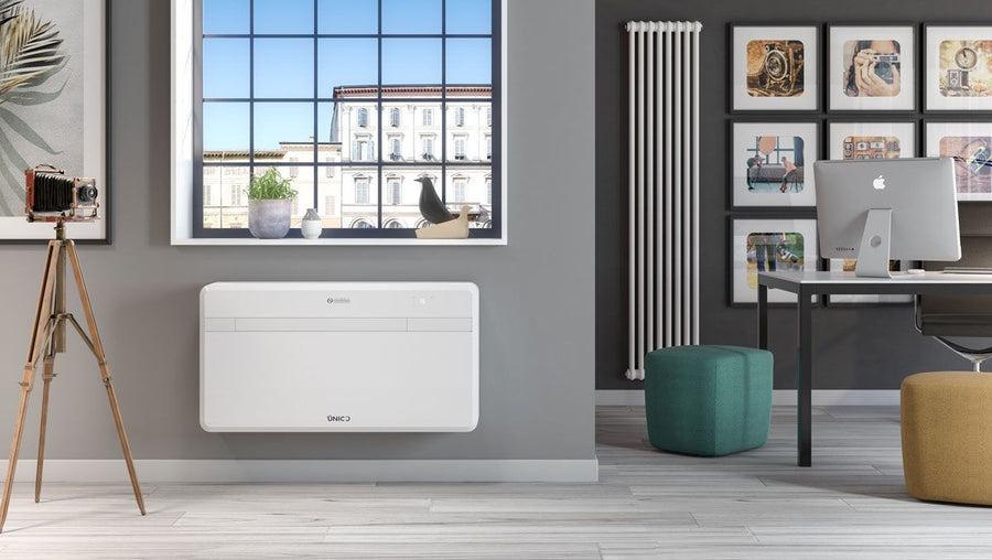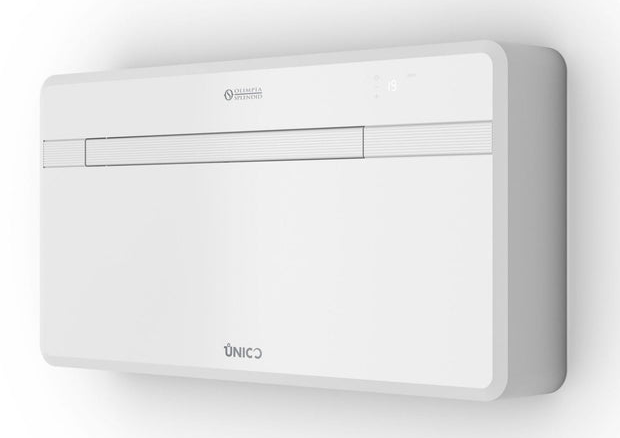 Olimpia Splendid Unico EVO 30 HP EVAN Monoblock-Klimaanlage mit IPX4-Schutzklasse Olimpia Splendid Unico EVO 30 HP EVAN Monoblock-Klimaanlage mit Wärmepumpe zur Selbstmontage und ohne Außeneinheit. Genießen Sie das ganze Jahr über maximalen Komfort! Die Unico-Modelle sind perfekt für Bereiche, in denen die Installation eines herkömmlichen Split-Geräts nicht möglich oder gewünscht ist. Dank der einfachen Montage, seinem kompakten Design (18 cm breit) und dem Verzicht auf ein Außengerät sind sie ideal für Wohnungen, denkmalgeschützte Gebäude oder Ferienhäuser. Dieses All-in-One-System mit integrierter Wärmepumpentechnologie (HP) ist eine lohnende Investition und dank der Inverter-Technologie zudem energieeffizient (Energieeinsparung von bis zu 30 % gegenüber herkömmlichen Klimaanlagen). Es stehen vier Betriebsarten (Modi) zur Auswahl: Kühlen, Lüften, Entfeuchten und Heizen. Diese Funktionen können natürlich auch unabhängig voneinander ganzjährig in Räumen bis 30 m² verwendet werden. Die Steuerung kann direkt am Gerät, mit der Fernbedienung oder über eine App auf Ihrem Smartphone oder Tablet erfolgen. Mit der OS HOME App können Sie Ihren UNICO einrichten, programmieren und steuern, wo und wann Sie möchten: Temperatur, Lüftergeschwindigkeit oder Betriebsmodi. Inverter-Technologie: Energieeinsparung von bis zu 30 % gegenüber herkömmlichen Klimaanlagen SYNC Power System (für akustischen Komfort): besteht aus einem hocheffizienten Twin-Rotationskompressor und einer intelligenten Steuerungstechnologie, die perfekt aufeinander abgestimmt sind. Dadurch bietet dieses Gerät hervorragende Leistungen bei minimalem Geräuschpegel. Im Silent-Modus beträgt der Geräuschpegel maximal 30 dB(A). 4 Modi: Nur Heizen / Nur Kühlen / Nur Ventilator (nur Lüfterbetrieb) / Nur Entfeuchten ECO-Modus: Ermöglicht Energieeinsparung durch automatische Optimierung der Geräteleistung Auto-Modus: ändert Parameter mithilfe der Umgebungstemperatur Nacht-Modus: erhöht die eingestellte Temperatur schrittweise und reduziert die Geräuschemission für mehr Komfort während der Nacht (leiser Betrieb). IPX4-Schutzklasse: Spritzwassergeschützt von allen Seiten Bei den Olimpia Splendid Unico ist alles kompakt in einem Gerät integriert, während es bei herkömmlichen Klimageräten auf zwei Einheiten verteilt ist. Die Montage kann jeder Heimwerker problemlos selbst durchführen. Somit haben Sie einen geringen Installationsaufwand und keine störende Außeneinheit an der Fassade. Das Gerät ist ideal für geschützte Bauten, da nur zwei Lüftungsöffnungen (1 Zuluft und 1 Abluft) und ein kleines Loch für den Kondenswasserablauf benötigt werden. Zur weiteren Ausstattung gehört ein Multifiltersystem, bestehend aus elektrostatischem Filter (mit Anti-Staub-Funktion) und Aktivkohlefilter (wirksam gegen Gerüche). Die Filter sollten regelmäßig auf Verschmutzung geprüft und bei Bedarf gereinigt werden. Wärmepumpentechnik (HP): Wärmepumpe Klimaanlage – hiermit können Sie die traditionelle Heizung in den Übergangszeiten ersetzen oder unterstützen. ("COOL ONLY" deaktiviert die Heizfunktion und "WARM ONLY" deaktiviert Kühlfunktion.) Merkmale: Monoblock-Klimaanlage ohne Außengerät zur Selbstmontage 4 Betriebsfunktionen (4-in-1): Heizung, Kühlung, Entfeuchtung und Belüftung Wärmepumpen-Klimaanlage zur Kühlung und Zusatzheizung (HP) Für Bereiche bis 30 m² Einfache Bedienung: Infrarotbedienung, direkt am Gerät oder über die OS HOME App (integriertes WiFi) Kühlleistung 2,6 kW (Energieklasse: A+) Heizleistung 2,4 kW (Energieklasse: A) SYNC Power System: noch effektiver und leiser mit einem Geräuschpegel: 30 dB(A) - 43 dB(A) Inverter-Technologie: sorgt für eine Energieeinsparung bis zu 30 % Twin-Rotationskompressor Entfeuchtungsleistung: 0,7 Liter/Stunde = 16,8 Liter/Tag. 3 Lüfterstufen + Swingfunktion Luftverdrängung: bis 490 m³/h Großer Luftauslass: regulierbar und für eine gleichmäßige Luftverteilung im Raum Durchmesser der 2 Lüftungslöcher (Ø 162mm/Ø 202 mm.) Bitte beachten Sie: Die serienmäßig mitgelieferten Luftauslässe haben eine Größe von Ø 202 mm Zeitschaltuhr (Timer) Mit Multifiltersystem: elektrostatischem Filter (Anti-Staub) & Aktivkohlefilter Schutzklase IPX4 Kältemittel R32 Wandbefestigung Kein auffälliges Klimagerät an der Außenwand - nur zwei Lüftungslöcher und ein kleines Loch für den Kondenswasserablauf!
