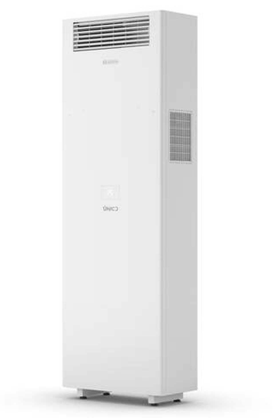 Olimpia Splendid Unico Vertical 35 HP EVANX Monoblock-Klimagerät mit Wärmepumpe zur Selbstmontage und ohne Außeneinheit. Dank seiner vertikalen Bauweise kann das Gerät auch in kleinen Bereichen aufgestellt werden, beispielsweise in Ecken oder zwischen Fenstern. Es ist perfekt für Räume bis zu 40 m² geeignet, in denen sich keine herkömmliche Split-Klimaanlage installieren lässt. Dieses Modell erkennt niedrige Außentemperaturen und schaltet automatisch von der Wärmepumpe auf Elektroheizung um (modulierender, elektrischer Widerstand + elektrisches Heizelement). Die Inverter-Technologie ermöglicht eine Energieeinsparung von bis zu 30 %: Energielabel A (Kühlen & Heizen). Die 4 Betriebsfunktionen (Kühlen, Lüften, Entfeuchten und Heizen) können auch unabhängig voneinander genutzt werden. Die Monoblock-Klimaanlage von Olimpia Splendid kann entweder direkt am Gerät oder über die OS HOME App bedient werden (WLAN-Verbindung und Smart Control), ganz bequem auch von unterwegs. Zur serienmäßigen Ausstattung gehören die innovative PRO-Power-Technologie (Super-Kühlleistung) sowie ein Multifiltersystem, bestehend aus einem elektrostatischen Filter mit Anti-Staub-Funktion und einem Aktivkohlefilter, der wirksam gegen unangenehme Gerüche ist. Als Kältemittel kommt das umweltfreundliche R32 zum Einsatz. UNICO®: ganzjähriger Komfort, leise und effizient - auch bei niedrigen Temperaturen