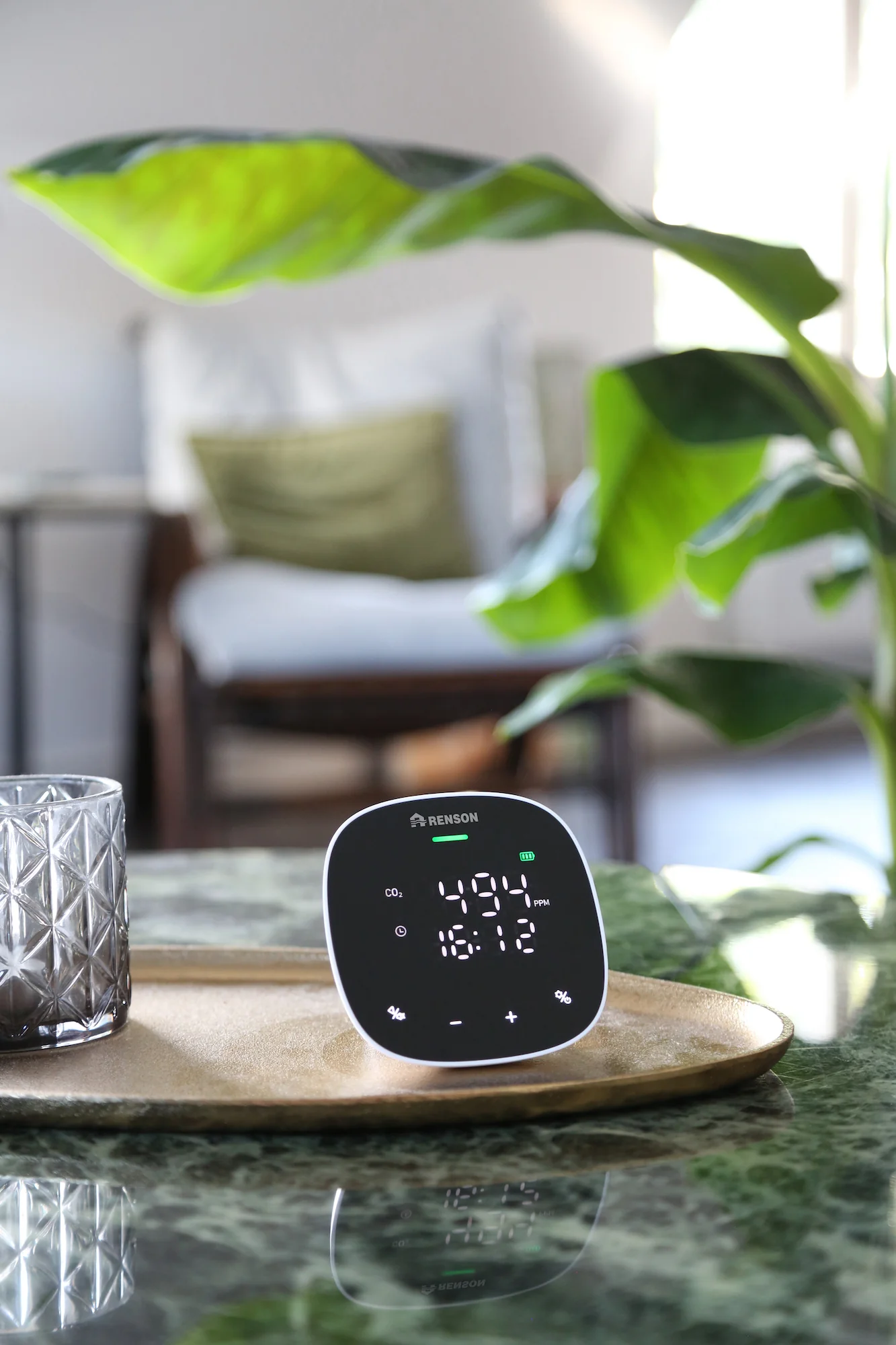 Renson® Sense GO CO₂-Messgerät kontrolliert die Kohlenstoff-Konzentration, die relative Luftfeuchtigkeit und die Raumtemperatur in Innenbereichen. Das kompakte Design und der wiederaufladbare Lithium-Akku machen den Senso GO zum perfekten Messgerät, das Sie überallhin mitnehmen können. Der große LED-Ring und die Symbole auf dem Gerät zeigen auf einfache Weise die Raumluftqualität (Grün, Gelb oder Rot) an und erinnern Sie um zu lüften. Renson® Creating healthy spaces®