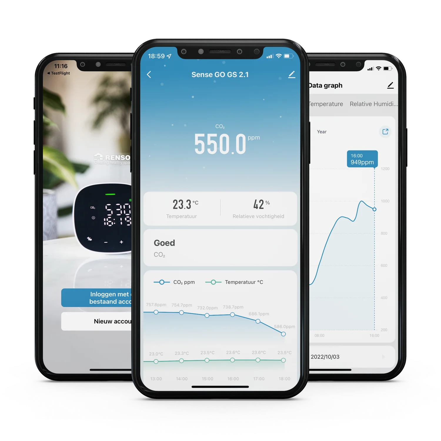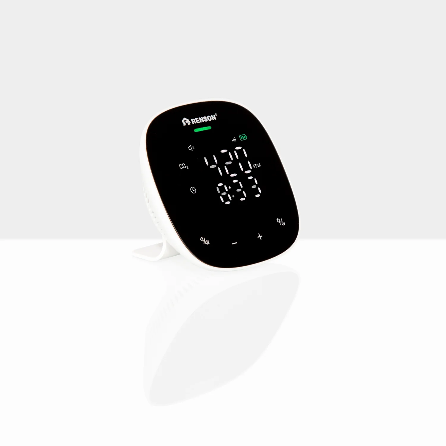 Renson® Sense GO zur Überwachung der Raumluftqualität Renson® Sense GO CO₂-Monitor ist ein kompaktes und präzises Messgerät zur Überwachung der Raumluftqualität. Optimale Benutzerfreundlichkeit zeichnet dieses Messgerät aus. Sense GO ist einfach in der Anwendung und auf dem intuitiven Display werden die aktuellen Werte deutlich angezeigt. Dank des LED-Rings und der Symbole erhalten Sie einen deutlichen Überblick über die Luftqualität. Auf der zugehörigen App kann die Qualität der Innenraumluft auch auf Abstand überprüft und konfiguriert werden. Der Sense GO misst die Raumluft alle 5 Sekunden, mit 3 Sensoren, den Innenbereich: CO₂-Gehalt Temperatur Relative Luftfeuchtigkeit Das übersichtliche Display zeigt in Farbcodes (Ampelfunktion) an, wann es wieder Zeit ist, um zu lüften. Grün: Gute Luftqualität und/oder Komfort Gelb: Durchschnittliche Luftqualität und/oder Behaglichkeit Rot: Schlechte Luftqualität und/oder Komfort Das kompakte Design und der wiederaufladbare Lithium-Akku machen Senso GO zum perfekten Messgerät für unterwegs. Er kann überallhin mitgenommen werden, wo er benötigt wird. Die Sense GO-App ist eine Basisapplikation, mit der Sie einen Überblick über die Raumluftqualität anhand von CO2-, Feuchtigkeits- und Temperaturmessungen erhalten. einfache Konfiguration Live-Daten geben Ihnen einen Einblick in Ihre aktuelle Raumluftqualität Übersicht über historische Daten Fernzugriff auf Ihre Live-Daten Merkmale: Kompaktes Plug-and-play Messgerät zur Überwachung der Raumluftqualität: CO₂-Gehalt Temperatur Relative Luftfeuchtigkeit Mit Sense GO-App - Konfiguration mittels APP Einfach mitzunehmen und überall sofort einsatzbereit Übersichtliches Display mit Echtzeit-Anzeige Farbige Ampelanzeige: Grün/Gelb/Rot) Stromversorgung über USB und Lithium-Batterie (wiederaufladbar) Wiederaufladbare Lithium-Batterie Messbereich: CO₂: 400 - 5000 ppm Messbereich Temperatur: -10 - 40 °C Messbereich Luftfeuchtigkeit: 10 - 95 % Material: Kunststoff Nachtmodus Tisch- oder Wandmodell Technische Daten: Stromversorgung via Adapter + Mikro-USB-Kabel (im Lieferumfang enthalten) Abmessungen (BxHxL): 9 x 2,6 x 9 cm Gewicht: 0,27 kg