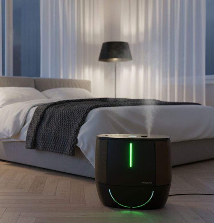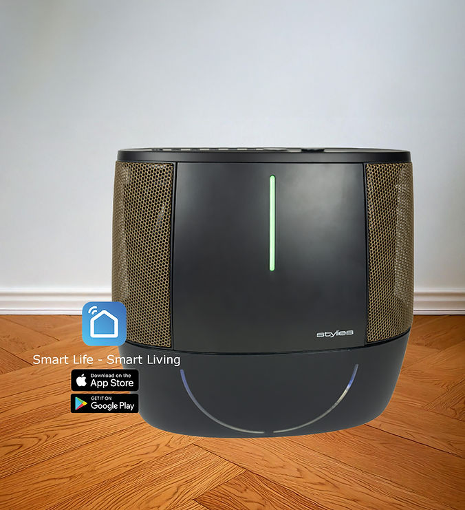 Stylies Antares Pro Luftwäscher mit integrierter WiFi‑Steuerung und antibakterieller Filtermatte Stylies Antares Pro Luftwäscher ist ein innovativer, energieeffizienter Luftbefeuchter und Luftreiniger in einem Gerät. Er unterscheidet sich vom klassischen Antares durch seine eleganten Farbakzente in Schwarz/Bronze sowie das integrierte WiFi, das eine komfortable App‑Steuerung ermöglicht. Als weltweit einziges Modell nutzt er die patentierte Clean Cube‑Technologie, die das Wasser antibakteriell behandelt und Kolibakterien (Citrobacter freundii) zuverlässig entfernt. Der Clean Cube mit Silversan‑Coplax‑Drahtsocken reduziert die Keimbelastung um 99,99 % und sorgt für maximale Hygiene. Für Räume bis 60 m² (150 m³) ausgelegt, erreicht der Antares dank D.A.S.T.-Technologie eine Befeuchtungsleistung von 11,5 Litern pro Tag. Die Direct Airstream Technology (D.A.S.T.) steigert die Befeuchtungsleistung um 30 % bei gleichzeitig 30 % geringerem Energieverbrauch. Die rotierende Filtermatte entfernt zuverlässig Staub und Pollen, während der integrierte Ionisator die Luft zusätzlich reinigt – ideal für Allergiker und Menschen mit empfindlichen Atemwegen. Im Gegensatz zu herkömmlichen Luftbefeuchtern arbeitet der Antares Pro ohne sichtbaren Nebel oder Ultraschall und verhindert so eine Überfeuchtung der Raumluft. Der Stylies Antares Pro Luftwäscher ist besonders einfach zu bedienen dank integriertem WiFi lässt er sich bequem über die App auf dem Smartphone oder direkt am Gerät überwachen und steuern. Eine optische Luftqualitätsanzeige, fünf Leistungsstufen, ein Hygrostat sowie eine Timerfunktion (2, 4 oder 8 Stunden) ermöglichen eine individuelle Anpassung. Der leise Nachtmodus mit gedimmten Anzeigen sorgt für ungestörten Schlaf und er passt seine Geschwindigkeit automatisch an die tatsächliche Raumfeuchte an. Optische Luftqualitätsanzeige gibt Auskunft über die Luftqualität und den Wasserstand: Grün: optimale Luftfeuchtigkeit Orange: trockene Luft Rot: Wassertank nachfüllen: einfach über die Öffnung an der Oberseite (Top-Filling-System). Für zusätzlichen Komfort verfügt der Antares über eine Duftstoffschublade für ätherische Öle, die einfach zu reinigen ist (spülmaschinenfestes Unterteil). Gerade in der Allergiesaison bietet der Antares spürbare Erleichterung: Er entfernt Allergene und Staub aus der Luft und befeuchtet sie gleichzeitig – für weniger brennende Augen, weniger laufende Nasen, bessere Konzentration und den Schutz von Möbeln und Materialien. Der formschöne Stylies Antares eignet sich für private wie gewerbliche Bereiche – etwa Wohnzimmer, Schlafzimmer oder Büros und fügt sich harmonisch in jedes Interieur ein. Merkmale: Für Räume bis 60 m² (150 m³) Doppelfunktion (2-in-1): Luftreinigung und Luftbefeuchtung Befeuchtungsleistung bis zu 0,46 Liter pro Stunde (11,5 Liter pro Tag) Mit integriertem WiFi - einfache Bedienung über die App auf Ihrem Smartphone oder Tablet Sehr energieeffizient und sehr leise Patentierte D.A.S.T.-Technologie für höchste Effizienz und Leistung Patentierte Clean Cube-Technologie Benutzerfreundliche, manuelle Bedienung mit 5 Geschwindigkeiten Integrierter Hygrostat für die Kontrolle und Steuerung der gewünschten Luftfeuchtigkeit Auto-Modus: Das Gerät passt seine Geschwindigkeit automatisch an die aktuelle Luftfeuchtigkeit an Ionisationsfunktion Timer-Funktion: (2, 4 oder 8 Stunden) Nachtmodus: Alle LED-Leuchten aus Leistungsaufnahme 11 Watt Feuchtigkeitsanzeige Wasserbehälter: 6 Liter Wasserstandsanzeige Automatische Abschaltung bei Wassermangel Integrierte Duftschublade Zubehör: STYLIES Clean Cube Wartung und Reinigung: Regelmäßig ausspülen und Wasser wechseln; die Unterteile sind spülmaschinenfest. Filterkassette und Clean Cube sollten nach der empfohlenen Nutzungsdauer ersetzt werden.