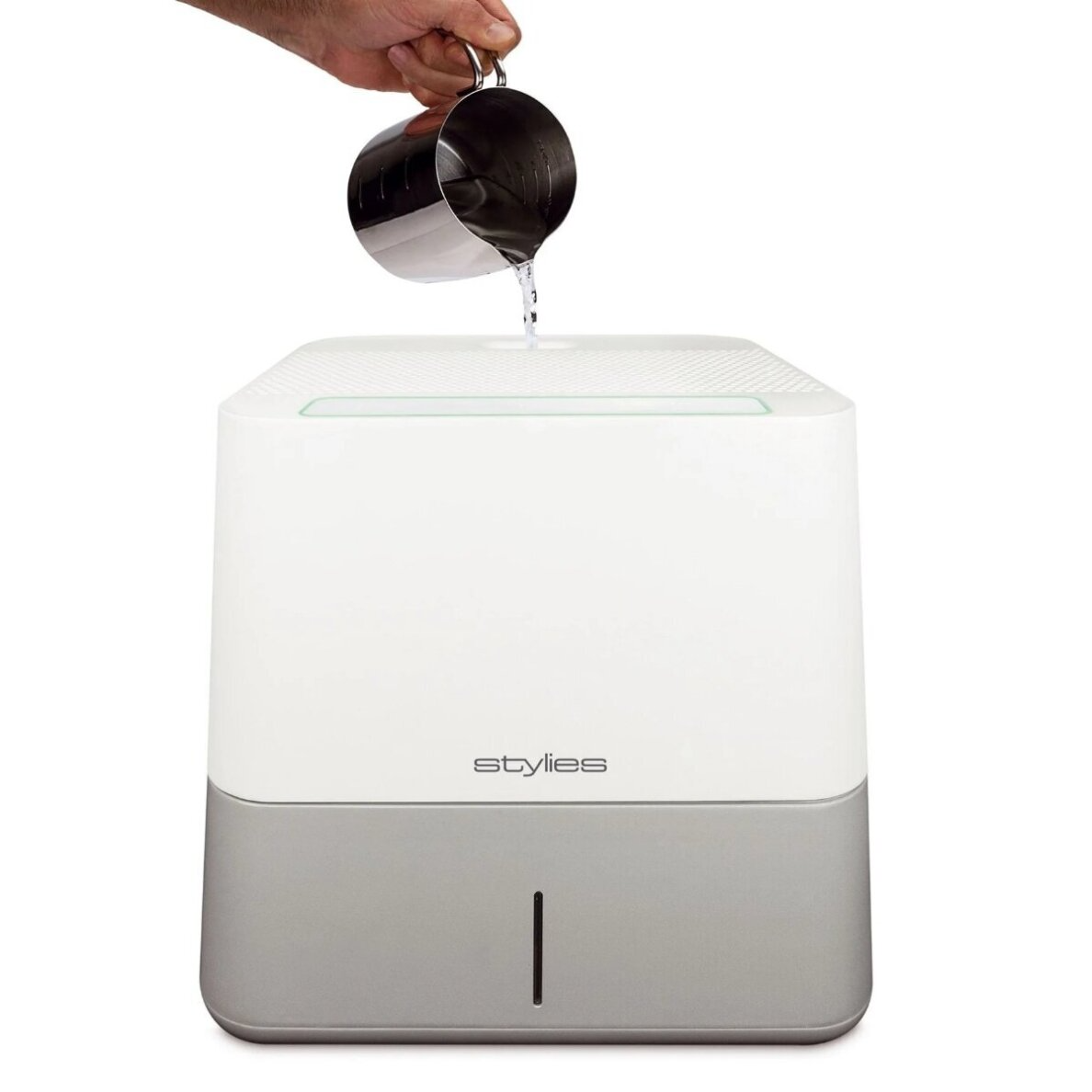 Stylies Signum Luftbefeuchter ist die perfekte Lösung für trockene Raumluft Stylies Signum Luftbefeuchter ist ein stilvoller und effizienter Verdunstungs‑Luftbefeuchter, der für ein angenehmes und gesundes Raumklima in Räumen bis 55 m² sorgt. Mit einer Befeuchtungsleistung von 9,6 Litern pro Tag und der innovativen Direct Airstream Technology (D.A.S.T.) steigert er die Leistung um bis zu 30 %, während der Energieverbrauch gleichzeitig um 30 % sinkt. Er befeuchtet die Luft hygienisch und energieeffizient nach dem natürlichen Verdunstungsprinzip – ganz ohne sichtbaren Nebel oder weiße (Kalk-)Ablagerungen. Der große 6,5‑Liter‑Wassertank ermöglicht lange Betriebszeiten, und die Wasserstandsanzeige erleichtert die Kontrolle. Der Signum nutzt eine speziell behandelte antibakterielle Filterkassette, die Wasser aus dem Tank aufnimmt. Ein interner Ventilator führt die trockene Raumluft durch den befeuchteten Filter und verteilt die befeuchtete Luft gleichmäßig im Raum. Dieser natürliche Prozess sorgt für eine effektive, hygienische und sichere Luftbefeuchtung – ohne Risiko der Überbefeuchtung. Bei leerem Tank schaltet sich das Gerät automatisch ab. Der Automatikmodus reguliert die Luftfeuchtigkeit selbstständig und passt die Befeuchtungsleistung automatisch an. Zusätzlich stehen drei Ventilatorstufen (Niedrig / Mittel / Hoch) zur Verfügung, um die Leistung optimal an Raumgröße und persönliche Bedürfnisse anzupassen. Mit der Timerfunktion bis zu 8 Stunden lässt sich der Betrieb bequem planen. Für zusätzlichen Komfort bietet der Stylies Signum ein Aromafach für ätherische Öle, sowie einen Nachtmodus ohne störende Beleuchtung – ideal für Schlaf‑ und Kinderzimmer. Der Stylies Signum wurde mit Blick auf Hygiene und einfache Pflege entwickelt. Der Silver Clean Cube nutzt die antibakterielle Wirkung von Silberionen, um Keime und Bakterien im Wasser zu reduzieren (patentierte Technologie). Der untere Teil des Gehäuses inklusive Wassertank ist spülmaschinengeeignet, was die Reinigung besonders einfach macht. Für eine dauerhaft optimale Leistung empfiehlt es sich, das Wasser regelmäßig zu wechseln und die Filterkassette in passenden Intervallen auszutauschen. Merkmale: Für Bereiche bis 55 m² Befeuchtungsleistung: 9,6 Liter pro Tag Effizienz dank D.A.S.T. Technology Patentierter Silver Clean Cube 3 Leistungsstufen Nacht-Modus Integrierter Hygrostat Antibakterielle Filterkassette Timerfunktion: Zeitschaltuhr2, 4 oder 8 Stunden mit automatischer Abschaltung Wassertank: 6,5 Liter - Top-Filling für einfaches Nachfüllen von oben Automatische Abschaltung bei leerem Tank Optische und akustische Warnsignale bei leerem Wassertank Geräuschpegel: 35 dB(A) Lichtindikator für Betriebsstatus Einfache Wartung Duftschublade für ätherische Öle Original Schweizer Design - Konstant perfekte Luftfeuchte