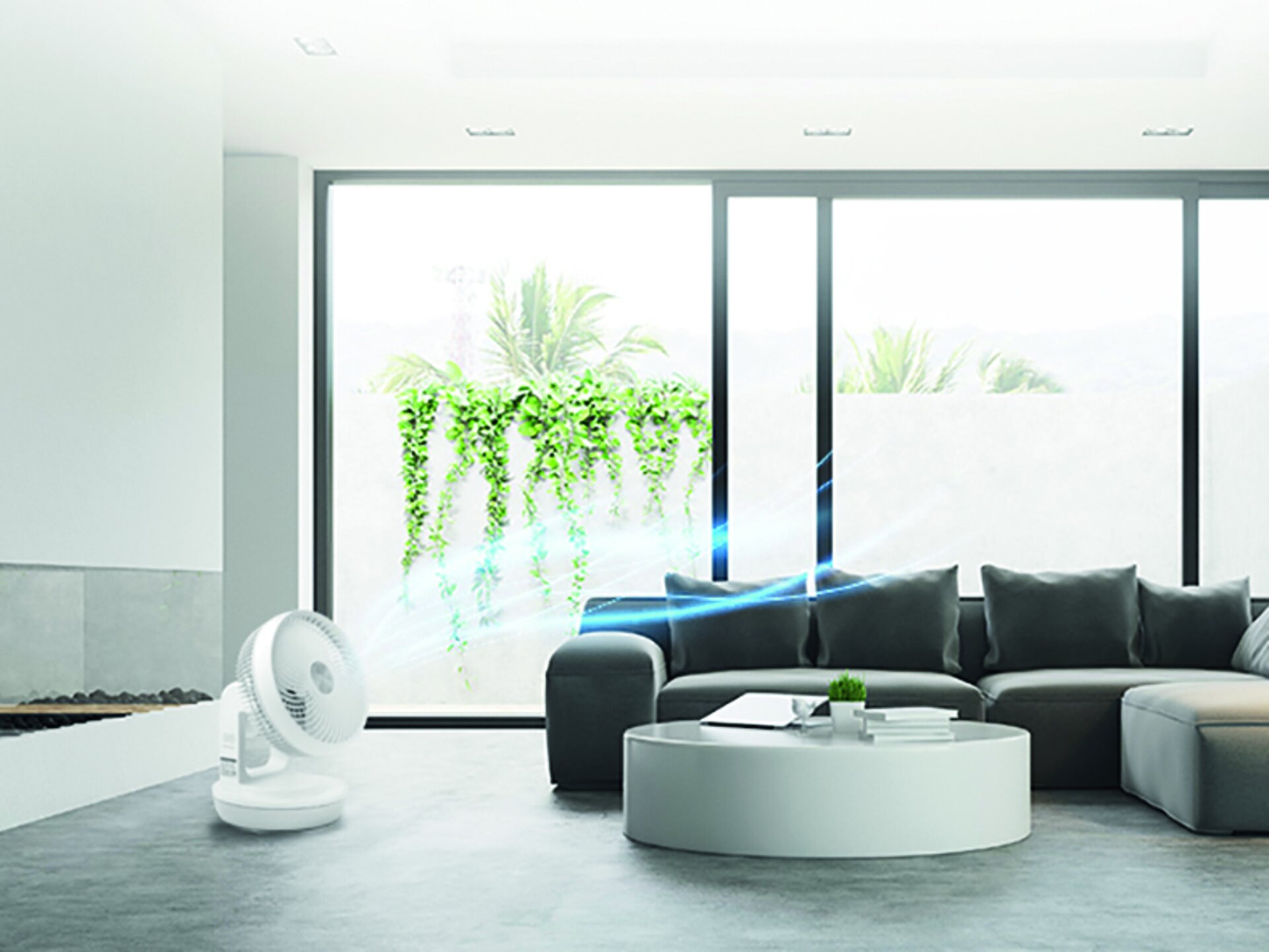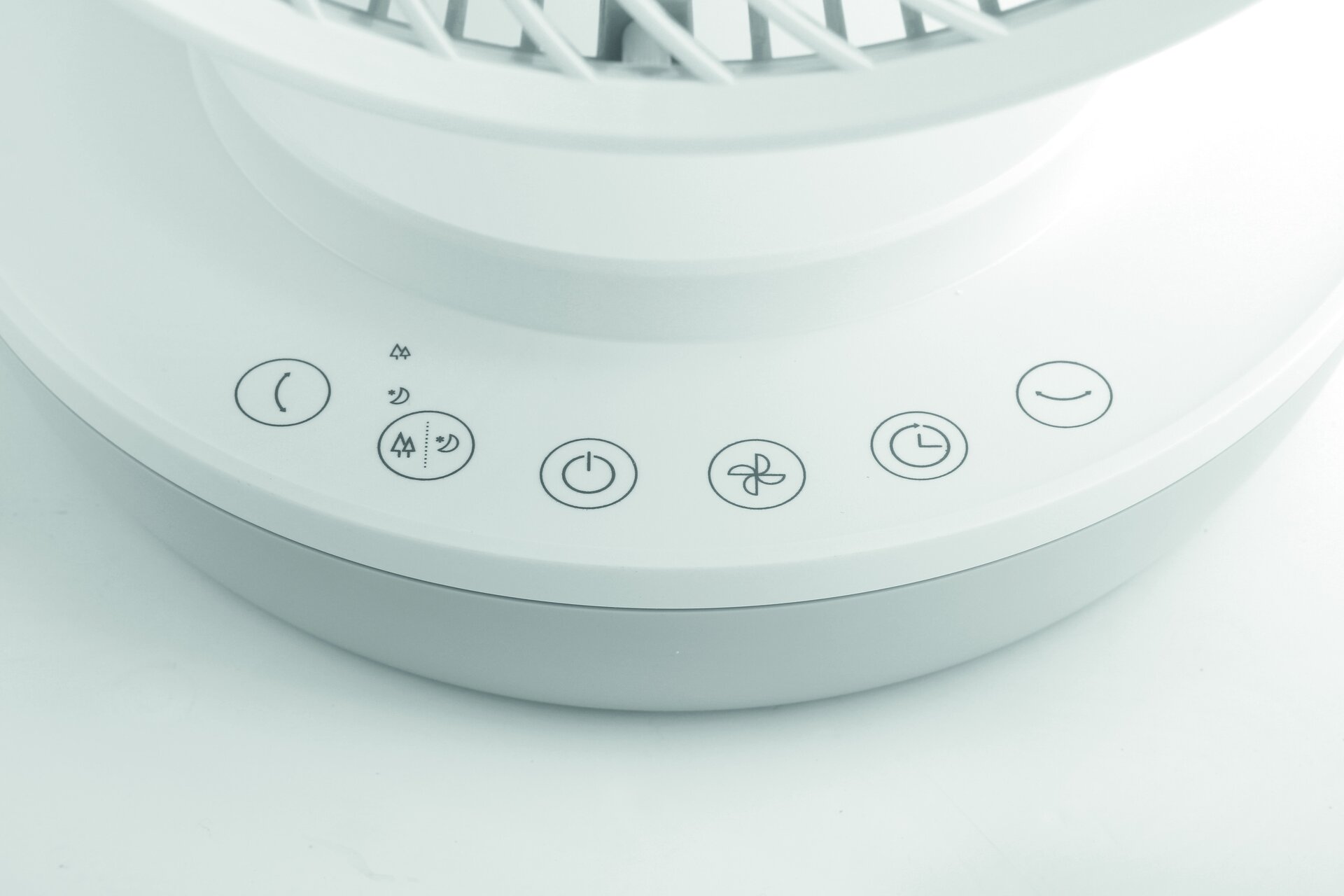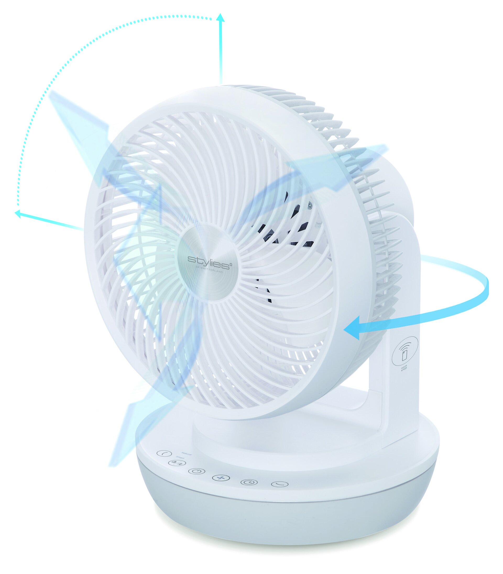Stylies Tara Ventilator ist ein leiser Tischventilator der sich in alle Richtungen bewegt und für eine optimale Luftverteilung sorgt. Tara kann nicht nur nach links, rechts, 30°, 60° und 90° oszillieren, sondern auch in gleichem Maße um die vertikale Achse. Die großflächige Oszillation sorgt für zusätzlichen Komfort und ist ein entscheidender Vorteil gegenüber herkömmlichen Modellen. Sie können zwischen 3 Geschwindigkeitsstufen und zwei verschiedene Lüfter-Modi (Natur- und Schlafmodus) wählen. Digitales Display mit Touch-Bedienung, Timerfunktion und praktischer Fernbedienung für Räume bis 45 m² (Luftumwälzung von 960 m³/h).