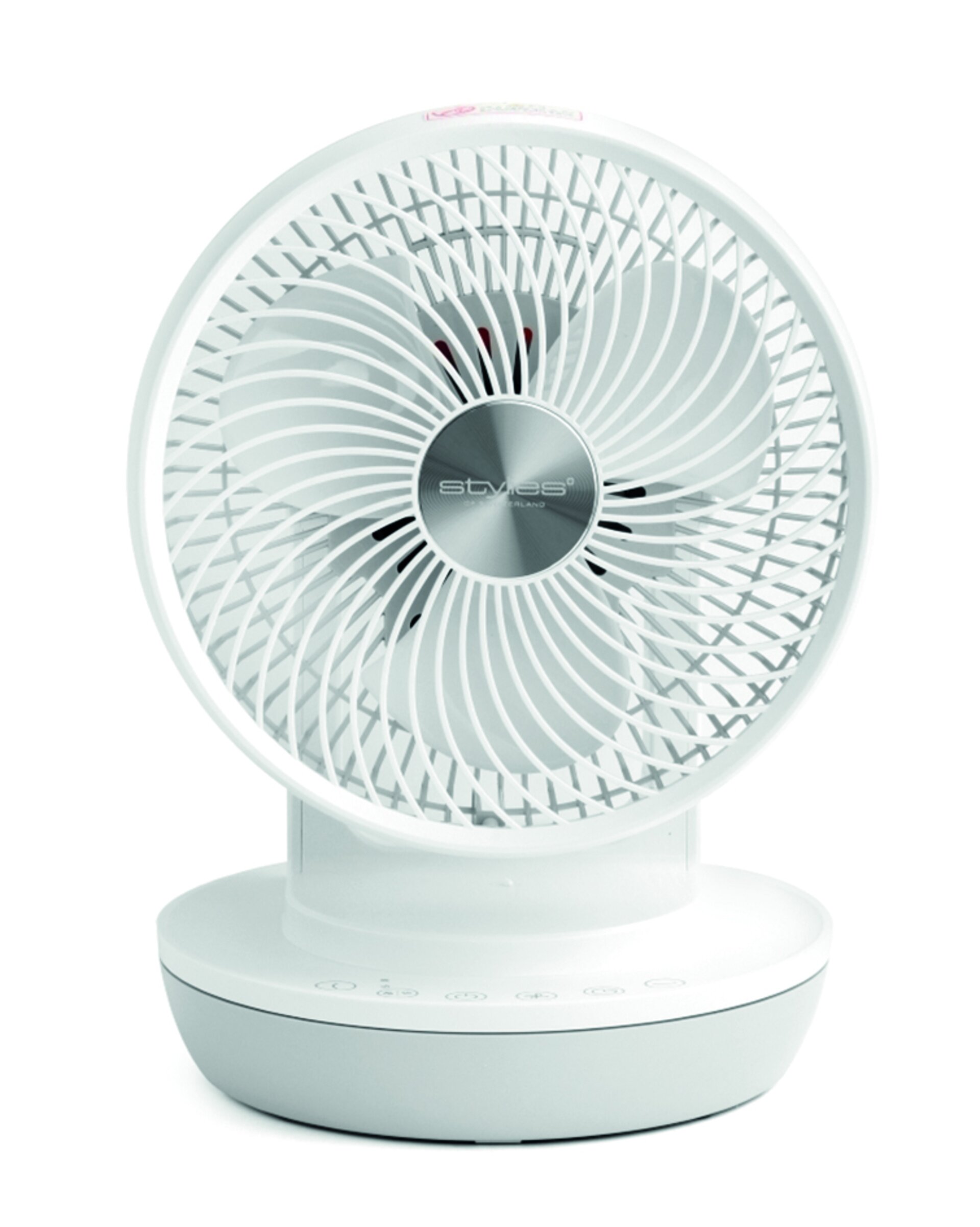 Stylies Tara Ventilator leistungsstarker Tischventilator mit 3D-Oszillation Stylies Tara Ventilator ist ein leiser Tischventilator, der sich in alle Richtungen bewegt und für eine optimale Luftverteilung sorgt. Tara kann nicht nur nach links, rechts, 30°, 60° und 90° oszillieren, sondern auch in gleichem Maße um die vertikale Achse. Die großflächige Oszillation sorgt für zusätzlichen Komfort und ist ein entscheidender Vorteil gegenüber herkömmlichen Modellen. Dieser Tischventilator benötigt nur wenig Platz und Sie können aus 3 Leistungsstufen sowie zwei verschiedenen Lüfter-Modi: Naturmodus: simuliert den natürlichen Wind in 3 Geschwindigkeiten komplett mit natürlichen Böen Nachtmodus (Schlafmodus): sorgt für ein beruhigendes Windmuster wählen. Sie können den Luftstrom vertikal, horizontal oder in beide Richtungen gleichzeitig (3D) oszillieren lassen und den Timer (Zeitschaltuhr) auf die gewünschte Zeit programmieren. Tara kann einfach über das digitale Display mit Touch-Bedienung oder die mitgelieferte Fernbedienung reguliert werden. Für Räume bis 45 m² (Luftumwälzung von 960 m³/h). Stylies Tara sorgt für eine optimale Luftverteilung, das ganze Jahr über! An warmen Sommertagen sorgt er für eine angenehme Abkühlung und verteilt die kühle Luft gezielt in Ihrem Raum. Dieser Lüfter kann jedoch auch während der kalten Wintermonate verwendet werden. In der Heizperiode erhöht er den Warmluftstrom und verbessert die Heizeffizienz. Die 3D-Oszillation hat nicht nur eine große Reichweite, sondern ermöglicht auch einen effizienten Gebrauch des Lüfters. Tara kann in einem Winkel von 30°, 60° oder 90° oszillieren (schwenken) und mit einem kleineren Winkel kann z.B. eine Person besser erreicht werden und der maximale Winkel sorgt für eine gleichmäßigere Luftverteilung über die gesamte Raumbreite. Merkmale Für Räume bis 45 m² Hochwertige Materialien, stabile Konstruktion im samtigen Weiß Luftumwälzung: 960 m³/h 3D-Oszillation mit großer Reichweite: Oszillation des Ventilators in einem Winkel von 30°, 60°, 90° Fernbedienung mit übersichtlichem Display (inkl. Lithiumbatterien) 3 Lüftergeschwindigkeiten 2 Lüfter-Modi: Natural / Sleep (Night) Zeitschaltuhr: 1 - 8 Stunden Geräuschpegel bis zu 42,6 dB(A) Stromverbrauch 45 Watt Abnehmbares Frontgitter zur einfachen Reinigung Stylies Tara Ventilator - Designprodukt in geprüfter Schweizer Qualität