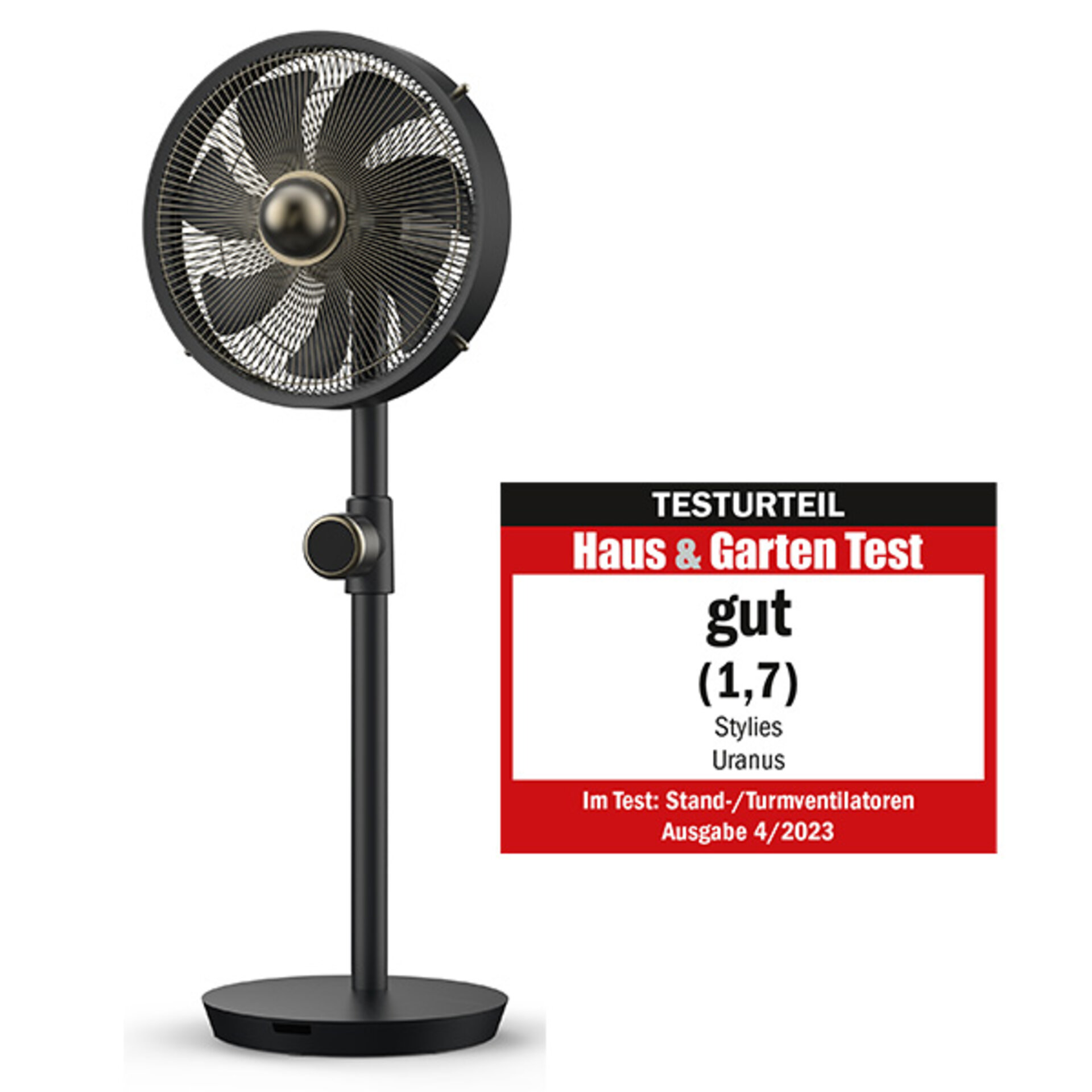 Stylies Uranus Ventilator ist ein höhenverstellbarer Standventilator aus hochwertigen Materialien und mit zahlreichen Funktionen. Uranus besticht mit seinem edlen Design und ist mit einem leistungsstarken DC-Motor ausgestattet, der einen reibungslosen und leisen Betrieb garantiert. Die Bedienung ist einfach und erfolgt entweder mittels Ein-Knopf-Bedienung (befindet sich am Stativ des Ventilators) oder Fernbedienung. Sie können aus 12 Lüftergeschwindigkeiten wählen und die AUTO-Oszillation von 30°, 60° oder 90° sowie der manuell verstellbare Winkel (35°) sorgen für eine optimale Luftverteilung. Uranus eignet sich für Räume bis 80 m² mit einem Luftstrom von 5,6 m/s. Testurteil Gut (1,7) der Zeitschrift HAUS & GARTEN (4/2023)