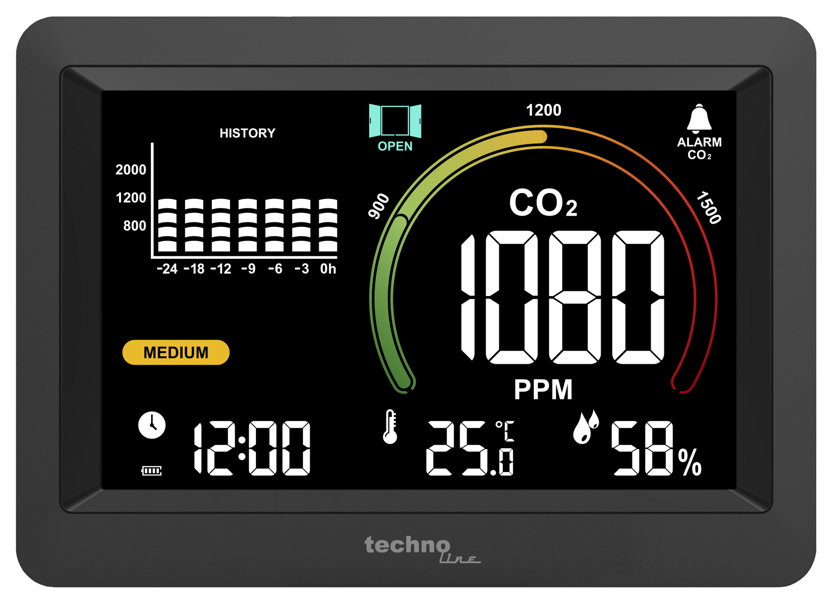 Technoline WL 1028 CO₂-Messgerät ist mit einem leistungsstarken CO₂-Sensor ausgestattet (bis 5000 ppm). Der Luftgütemonitor überwacht die Raumluftqualität und zeigt diese mit Farben und Symbolen an. Auf seinem übersichtlichen Display ist die CO₂-Konzentration (und Verlauf), Luftfeuchtigkeit, Raumtemperatur und Zeit deutlich ablesbar. Technoline WL 1028 gibt Lüftungsempfehlung auf Basis der CO₂-Konzentration in der Luft (4-farbiges Anzeigeelement). Ausgestattet mit einer einstellbaren Alarmfunktion, die sich bei einem zu hohen oder zu niedrigen CO₂-Wert einschaltet (optional akustischer Alarm).