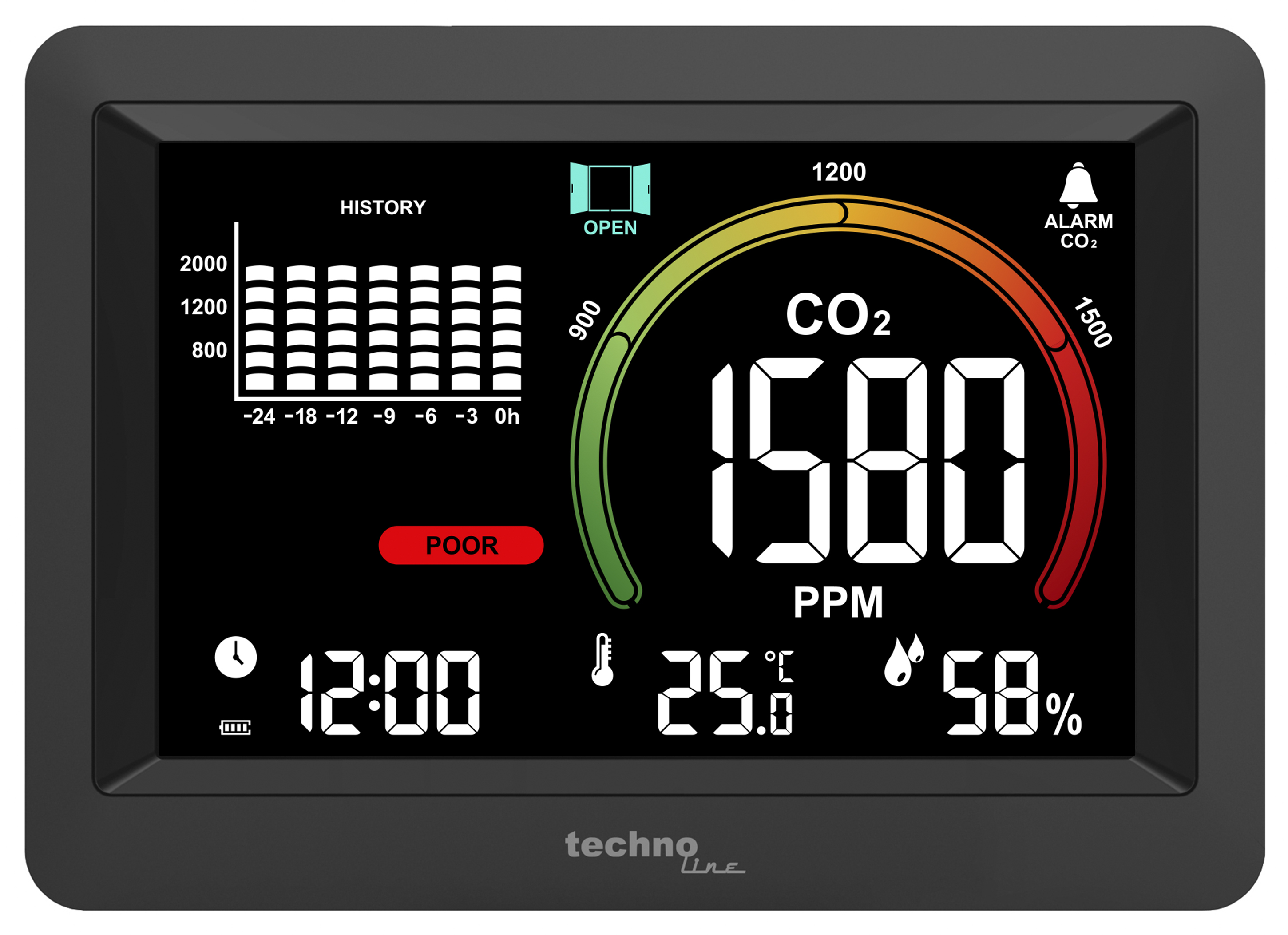 Technoline WL 1028 CO₂-Messgerät mit einstellbarem Alarm und CO₂-Historie Technoline WL 1028 CO₂-Messgerät ist mit einem leistungsstarken CO₂-Sensor ausgestattet (bis 5000 ppm). Der Luftgütemonitor überwacht die Raumluftqualität und zeigt diese mit Farben und Symbolen an. Auf seinem übersichtlichen Display ist die CO₂-Konzentration (und Verlauf), Luftfeuchtigkeit, Raumtemperatur und Zeit deutlich ablesbar. Technoline WL 1028 gibt Lüftungsempfehlung auf Basis der CO₂-Konzentration in der Luft (4-farbiges Anzeigeelement). Ausgestattet mit einer einstellbaren Alarmfunktion, die sich bei einem zu hohen oder zu niedrigen CO₂-Wert einschaltet (optional akustischer Alarm). Merkmale: Anzeige von CO₂-Konzentration, Temperatur, Luftfeuchtigkeit und Zeitanzeige Leistungsstarker CO₂-Sensor mit Messbereich von bis zu 5000 ppm Mehrfarbige Anzeige der Luftqualität: 4 Helligkeitsstufen (hoch – mittel – niedrig – aus) CO₂-Historie bis zu 24 Stunden (Diagramm): 24-Stunden-Historien-Balkendiagramm der gemessenen CO₂-Konzentration CO₂-Konzentrationsalarmfunktion: Alarme für zu hohe oder zu niedrige ppm-Werte einstellbar (optional akustischer) Manuelle Kalibrierung und automatische Kalibrierung für CO₂ Zeichnet die Maximal- und Minimalwerte von Temperatur, Luftfeuchtigkeit und CO₂-Konzentration auf Energieanzeige und Ladeanzeige des eingebauten Lithium-Akkus 12/24-Stunden-Zeitanzeige Anzeige der Temperatureinheit in °C / °F wählbar Hintergrundbeleuchtungsfunktion USB-Kabel im Lieferumfang enthalten Integrierter Akku (Lithiumbatterie - vollgeladen ca. 20 Stunden betriebsbereit) Energieanzeige und Ladeanzeige der eingebauten Lithiumbatterie Tisch- oder Wandmodell