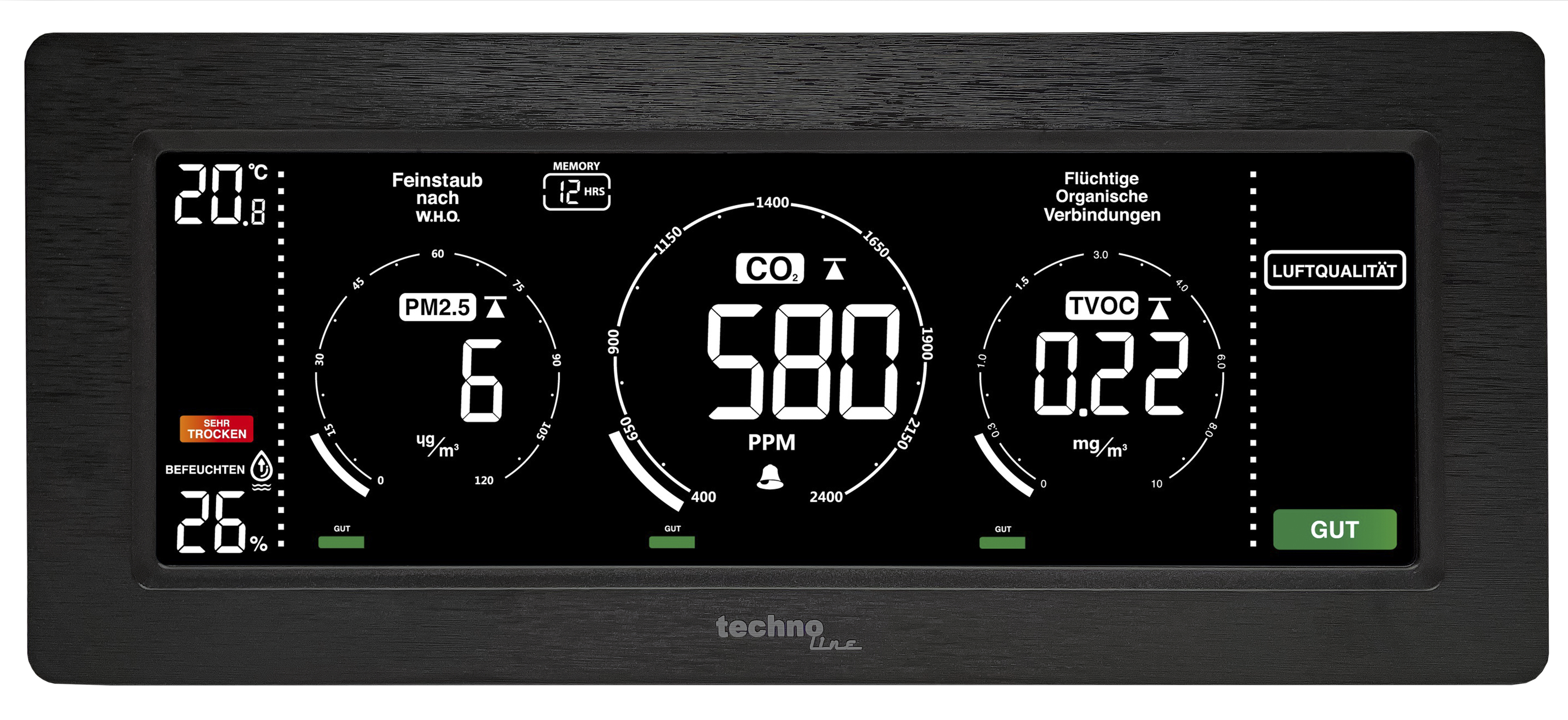 Technoline WL1035 Luftqualitätsmessgerät mit Ampelfunktion und Hintergrundbeleuchtung Technoline WL1035 Luftqualitätsmessgerät zur Überwachung der Raumluftqualität. Dieser Luftqualitätsmonitor kontrolliert: CO₂-Konzentration TVOC Feinstaub (PM 2.5) Raumtemperatur Luftfeuchtigkeit (rF). Die Messwerte sind am übersichtlichen, großen Display einfach abzulesen und dank der praktischen Ampelfunktion mit Belüftungsempfehlung können Sie die Messparameter rasch auswerten und interpretieren. Außerdem warnt die Ampelfunktion bei Überschreitungen gesunder Werte. Mit einstellbarem Alarm, programmierbarem MIN/MAX-Speicher für Thermo-Hygro, PM 2.5, CO₂ und allgemeine Luftqualität, automatische Kalibrierung und farbigen Anzeigeelementen. Schlechte Raumluft kann die Gesundheit schädigen. Regelmäßiges und rechtzeitiges Lüften ist daher unerlässlich für ein gesundes Raumklima. Merkmale Luftqualitätsmessgerät zur Überwachung der Raumluftqualität Messung und Anzeige von Feinstaub nach W.H.O. (PM2,5), flüchtige organische Verbindungen (TVOC) und CO₂ Anzeige der Innentemperatur Innenfeuchtigkeitsanzeige Farbige Anzeigeelemente Automatische Kalibrierung der PM2,5-, TVOC- und CO₂-Basislinien Blinkende Informationsanzeige bei zu trockenem oder zu feuchtem Raumklima (Schimmelgefahr) Einstellbarer Alarm für hohen oder niedrigen CO₂-Gehalt mit optionalem akustischem Alarm MIN/MAX-Speicher für Thermo-Hygro, PM2,5, TVOC, CO₂ und allgemeine Luftqualität mit programmierbarer Dauer bis zu 36 Stunden Eingebauter Speicherchip zum Speichern von Einstellungen Hintergrundbeleuchtung mit einstellbaren Helligkeitsstufen Wand- oder Tischmodell Spezifikationen CO₂-Messbereich: 400 bis 5000 ppm PM2,5-Messbereich: 0 bis 999 ug/m³ TVOC-Messbereich: 0,2 bis 9,99 mg/m³ Stromversorgung: Netzteil und USB-Kabel (im Lieferumfang enthalten)