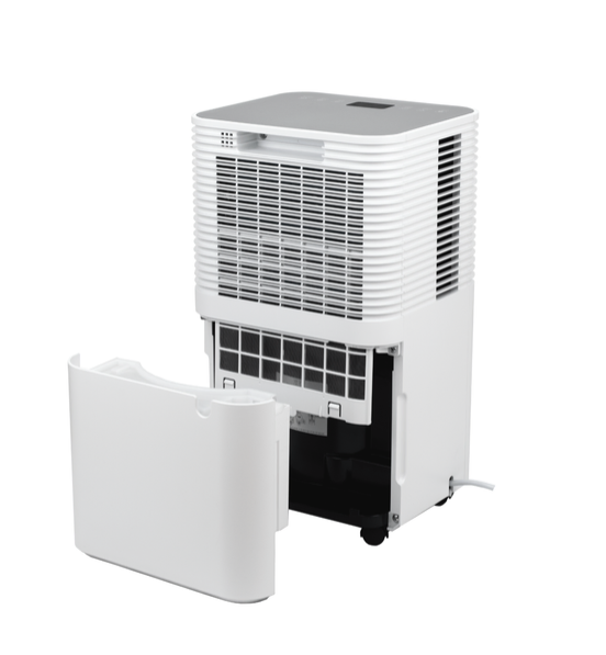 Turbionaire EPI 12 WiFi Luftentfeuchter mit WiFi-Verbindung (kompatibel mit Alexa & Google) Mit dem Luftentfeuchter Turbionaire EPI 12 können Sie dank der kreisförmigen LED-Feuchtigkeitsanzeige an der Vorderseite des Geräts auf einen Blick erkennen, ob die Luftfeuchtigkeit im Raum im gesunden Bereich liegt. Die Farbe ändert sich je nach Luftfeuchtigkeit im Raum: Blau: unter 45 % Grün: zwischen 45 und 65 % Rot: über 65 % Ein kompakter und geräuscharmer Kondensations-Entfeuchter der schnell und effizient bis zu 12 Liter Wasser pro Tag aus Räumen bis 50 m² entfernt. Das intuitive digitale Bedienungspanel an der Oberseite des Gerätes ermöglicht eine einfach Steuerung und die "Kindersicherung" schützt voor versehentliche Änderungen. Wählen Sie einfach eine der beiden Lüftergeschwindigkeit (2 Gebläsestufen) und stellen Sie den Feuchtesensor auf die gewünschte, relative Luftfeuchtigkeit - von 30 bis 80 % - ein. Auch der AUTO-Modus, SLEEP-Modus (nimmt die Lichtintensität für mehr Komfort ab) oder die Wäschetrockner-Funktion können hier gesteuert werden. Alle Funktionen können bei diesem Turbionaire Luftentfeuchter auch fernbedient werden. Das integrierte WLAN (WiFi) ermöglicht die Bedienung und Steuerung auf Abstand: SMART Life-APP, aber auch kompatibel mit Alexa & Google für eine Überwachung der Luftfeuchtigkeit in Echtzeit. Der Lufttrockner arbeitet sehr leise (max. 38 dB (A) und entfeuchtet bereits bei niedrigen Raumtemperaturen von 5 bis 32 °C. Das Kondensat wird im integrierten Wassertank aufgefangen (Tankvolumen 2 Liter) und selbstverständlich ist auch dieser Luftentfeuchter mit einer Schnellkupplung für den kontinuierlichen Kondensatablauf ausgestattet. Ob im privaten oder gewerblichen Bereich, zu Hause oder im Büro - mit seinem modernen, mattweißen Design passt er in jedes Ambiente. Der integrierte Griff und die Transportrollen erleichtern den Transport. Zu hohe Luftfeuchtigkeit kann nicht nur die Gesundheit beeinträchtigen und zu Allergien und Atembeschwerden führen, sondern auch Wände, Möbel, Bücher oder Fußböden beschädigen oder sogar zerstören. Merkmale Für Bereiche bis 50 m² Entfeuchtungsleistung von 12 Liter pro Tag Kompressor-Luftentfeuchter mit niedrigen Betriebskosten Mit WiFi (WLAN): SMART Life-APP - kompatibel mit Alexa & Google Einfache Bedienung & übersichtliches Display LED-Feuchtigkeitsanzeige: Blau / Grün / Rot 2 wählbare Gebläsestufen AUTO-Modus Schlafmodus Wäschetrockner-Funktion Zeitschalter (Timer): 1 - 24 Stunden Waschbarer Luftfilter (einfach zu entfernen und zu reinigen) Sehr leise im Betrieb: Geräuschpegel max. 38 dB(A) Integrierter, elektronischer Hygrostat Automatisches Abtauen Wassertank: 2 Liter Kindersicherung Automatisches Abschalten bei vollem Wassertank (mit Signal) Möglichkeit eines permaneten Kondensatanschlusses Automatischer Neustart nach einem Stromausfall unter Beibehaltung der Einstellungen Kompakt und einfach zu transportieren: integrierte Handgriffe + Rollen Umweltfreundliches Kältemittel R290