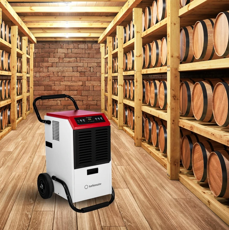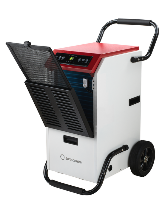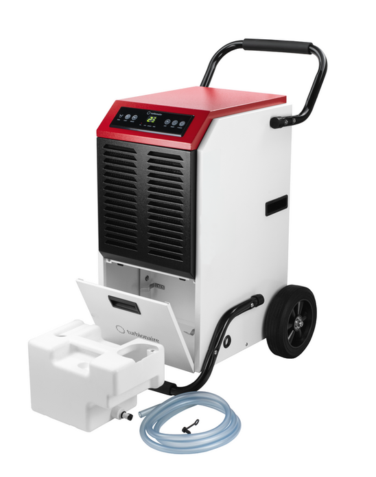 Turbionaire PRO 70N Bautrockner für den Einsatz in anspruchsvollen und/oder professionellen Umgebungen. Mit einer Entfeuchtungsleistung von 70 Liter / Tag und einem Luftdurchsatz von 470 m³/h sorgt dieser leistungsstarke professionelle Luftentfeuchter für eine gesunde relative Luftfeuchtigkeit in Bereichen bis zu 300 m². Turbionaire PRO 70N ist ein tragbarer Luftentfeuchter mit robuster Konstruktion und stabilem Gehäuse, der auch unter schwierigen Bedingungen zuverlässig trocknet. Das Kondenswasser (der Luft entzogene Feuchtigkeit) wird entweder im abnehmbaren Wassertank gesammelt oder direkt über einen Ablaufschlauch abgeleitet. Der Profi bei zu feuchter Luft oder zur Beseitigung von Wasserschäden in Lagerhallen, auf Baustellen, in Fabriken, Kellern, Bibliotheken oder Museen.