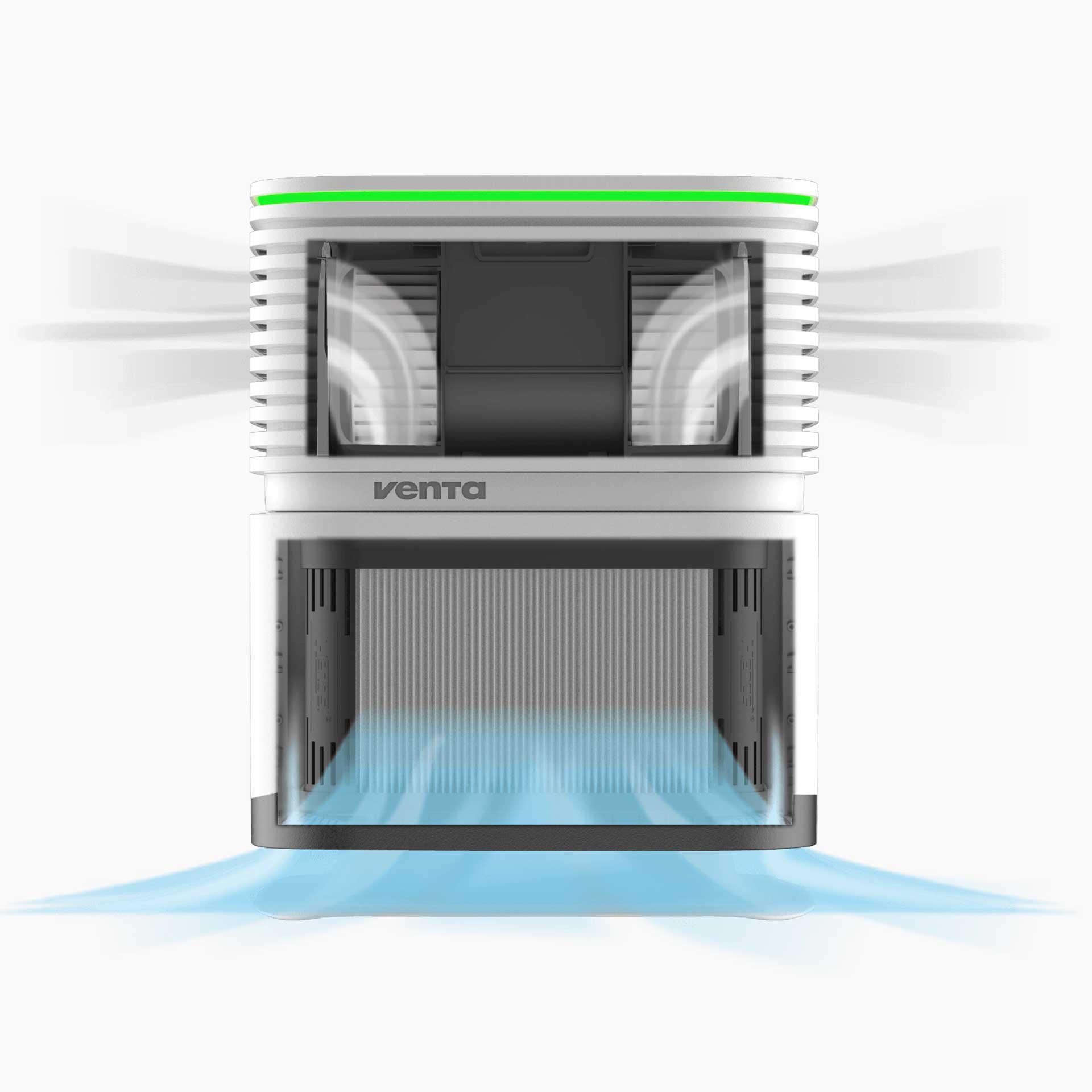 Venta AP730/AP735 AeroStyle Compact Luftreiniger Für saubere Luft in Ihrem Zuhause Sie möchten saubere Luft atmen? Am liebsten frei von unsichtbaren Pollen, Allergenen, Viren und Schadgasen? Dann ist der smarte AeroStyle Compact genau das Richtige für Sie. Dank seiner revolutionären Luftreinigungstechnologie entfernt er 99,97 % aller Schadstoffe aus der Raumluft. Die Bedienung ist dank Automatikmodus, App und Sprachsteuerung kinderleicht. Das zeitlose, elegante Design passt zudem zu jeder Einrichtung. Entfernt 99,97 % aller (un)sichtbaren Partikel und Schadgase aus der Luft. Venta Luftreiniger sorgen für saubere Luft, indem sie bis zu 99,97 % der kleinsten und unsichtbaren Partikel in Ihrem Raum filtern, darunter Allergene, Feinstaub, Viren, andere Luftschadstoffe und Schadgase bis zu einer Größe von 0,3 Mikrometern. So genießen Sie frisch gereinigte und gesündere Luft (CADR 320 m³/h: 99,97 %). So funktioniert es: Der Luftreiniger saugt Raumluft an, reinigt sie gründlich und gibt sie anschließend mithilfe der Venta AirFlow 360 Technologie wieder in den Raum ab. Die Luft strömt nahezu unmerklich über den Boden und wird gleichmäßig im Raum verteilt. Dank des intelligenten Filterdesigns werden selbst kleinste Partikel bis zu einer Größe von 0,3 Mikrometern im Filter aufgefangen. Für dreifache, optimale Filtration Das Herzstück des Luftreinigers ist das ausgeklügelte, würfelförmige Großfiltersystem, das eine leistungsstarke Luftreinigung gewährleistet. Das System besteht aus drei optimal aufeinander abgestimmten Filtern und sorgt so für gute Luftqualität in Ihrem Zuhause. Der Grobstaubfilter verfügt über eine besonders große Filterfläche und gewährleistet dadurch eine leistungsstarke Luftreinigung. Er dient primär dazu, gröbere Schmutzpartikel wie Staub oder Tierhaare aus der Luft zu filtern. Der sogenannte H13-Filter entfernt kleinste Partikel wie Bakterien und Viren, Allergene und Aerosole aus der Luft. Dieser Filter kommt auch in Operationssälen oder Bereichen mit höchsten Anforderungen an die Luftreinheit zum Einsatz. In Kombination mit den beiden anderen Filtern sorgt der Aktivkohlefilter dafür, dass neben Feinstaub und Pollen auch Schadgase und unangenehme Gerüche aus der Luft entfernt werden. Professionelle Sensortechnologie: Ihr persönlicher Assistent für saubere Luft Die hochwertige Sensortechnologie misst und überwacht Ihre Luftqualität und prüft Feinstaub (PM2,5) – sogar in Echtzeit. Besonders komfortabel: Sie können Ihren Luftreiniger ganz einfach per Sprachsteuerung bedienen oder aktuelle Informationen abrufen. Ambientebeleuchtung Der stilvolle Luftreiniger sorgt nicht nur für gute Luftqualität, sondern auch für angenehmes Licht in Ihren Räumen. Der elegante Lichtring leuchtet in verschiedenen Farben oder einfach weiß. Er informiert Sie außerdem in Echtzeit über Ihre Luftqualität gemäß dem weltweit anerkannten Luftqualitätsindex. Leuchtet der Ring grün, ist die Luftqualität optimal. Bei akzeptabler Luftqualität ändert sich die Farbe. Technologie Raumgrößen bis zu 75 m² 99,97 % Luftreinigung von Feinstaub, Viren, Pollen bis zu 0,3 µm Größe, Formaldehyd und Gerüchen (CADR 320 m³/h: 99,97 %) Revolutionäre und hocheffiziente Luftreinigung dank AirFlow 360 Technologie 360°-Luftauslass für eine gleichmäßige und natürliche Luftverteilung ohne störende Zugluft im Raum Leistungsstarker, großer Mehrschichtfilter für dreifache Luftreinigung: Grobstaubfilter, H13-Filter und Aktivkohlefilter Hochwertiges Sensorsystem für die Echtzeit-Anzeige der Luftqualität Extra Power: 5 Leistungsstufen und Turbomodus für eine intensivere Reinigung Geringer Stromverbrauch mit mindestens 4 Watt in der niedrigsten Stufe Angenehm leiser Betrieb: z. B. 22 dB in Stufe 1 WLAN-Funktion Eleganter Leuchtring Hergestellt in Deutschland