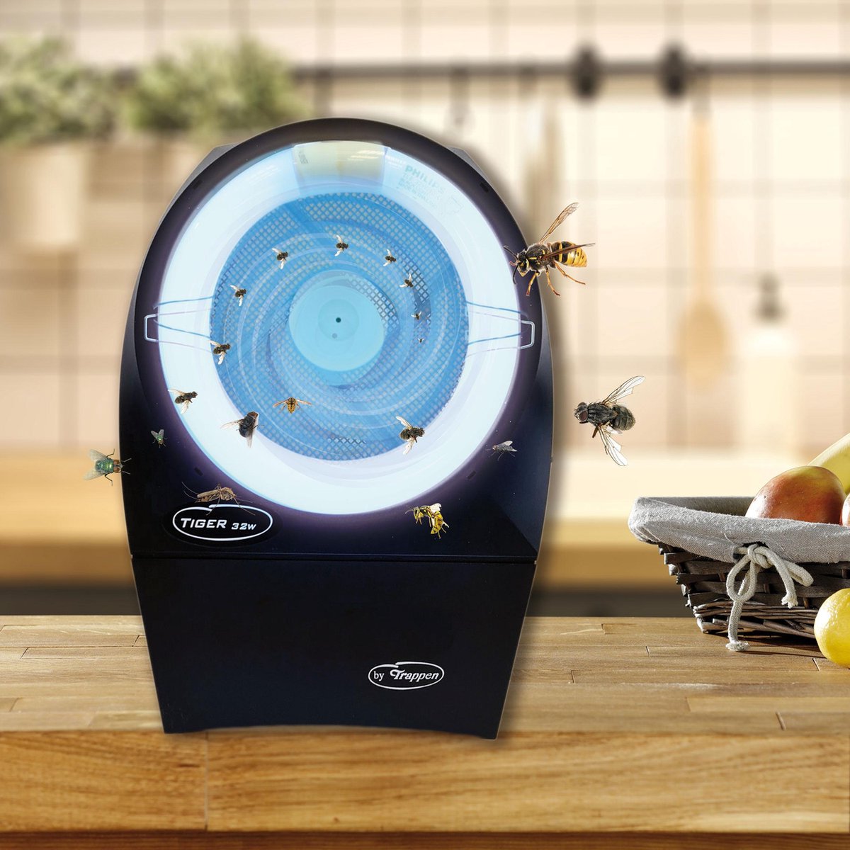 Trappen Wespenfalle Typ Black Tiger 32 W® ist ein professioneller Fluginsektenvernichter mit einer sehr hohen Fangquote von Wespen und anderen Fluginsekten. Die Wespenfalle bietet Ihnen eine hygienische Bekämpfung von Fluginsekten, ganz ohne den Einsatz von Insektiziden und Giftstoffen. Geeignet zur umweltfreundlichen Insektenabwehr in Innenräumen (bis 150 m²) wird der Fluginsektenvernichter europaweit u.a. in Cafés, Bäckereien, Metzgereien, Kantinen, Großküchen, Restaurants, Büros u.v.m. eingesetzt. Auch für Bereiche mit HACCP- und Hygienevorschriften geeignet.